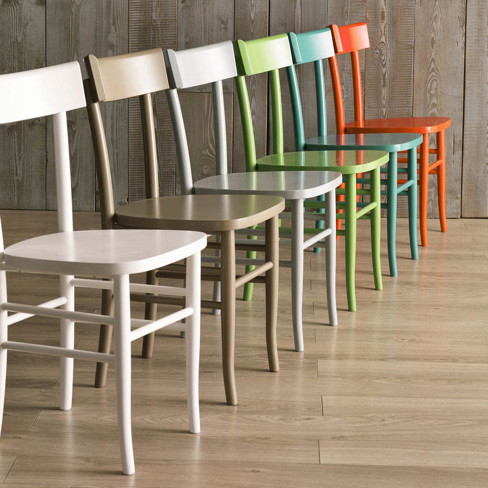 Stol i lakeret bøgetræ, fås i forskellige farvevarianter. Vælg den finish, du ønsker, fra rullemenuen.