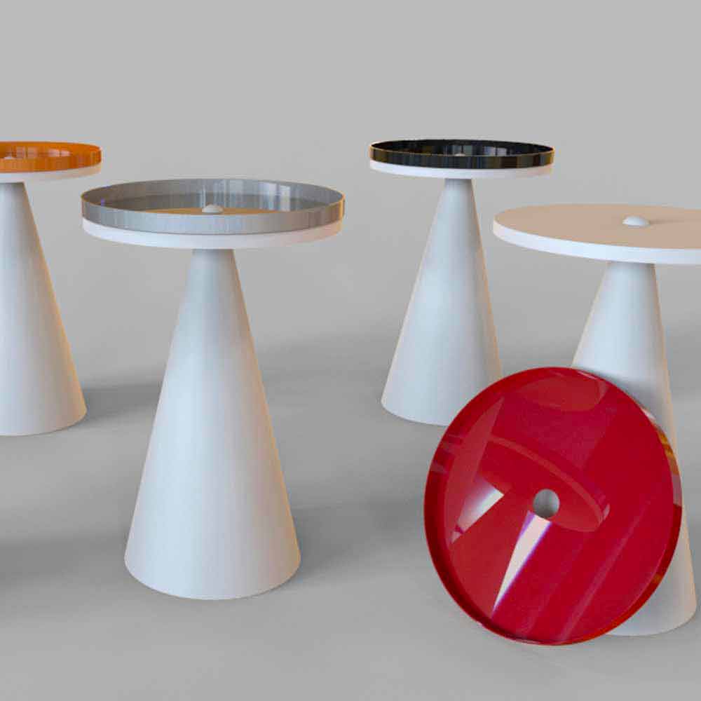 Basen, der er lavet af mat hvid afamatx, står i kontrast til den øverste top i blank lakeret metalplade. Sidstnævnte kan bruges separat, hvilket øger bakkens anvendelighed og garanterer samtidig en dobbelt støtteflade.