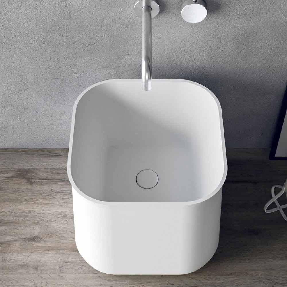 Firkantet håndvask i hvid harpiks, moderne design med høje kanter.