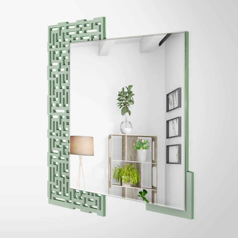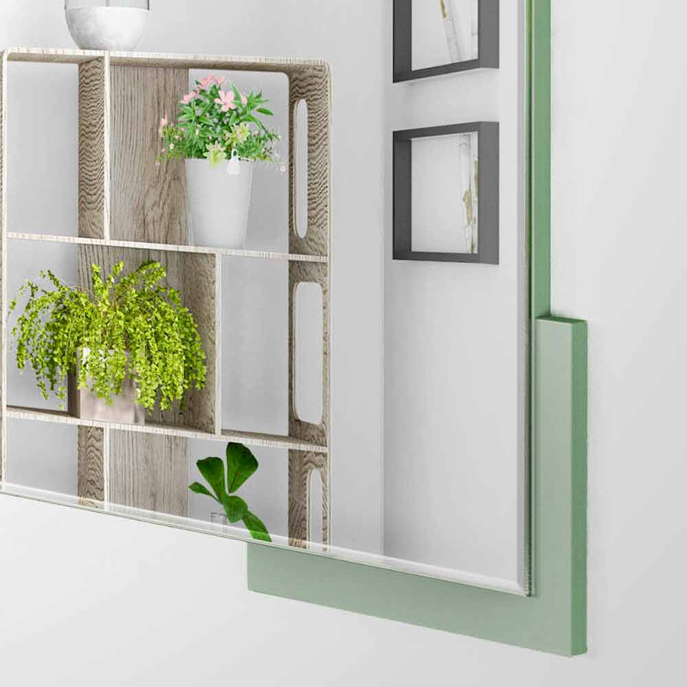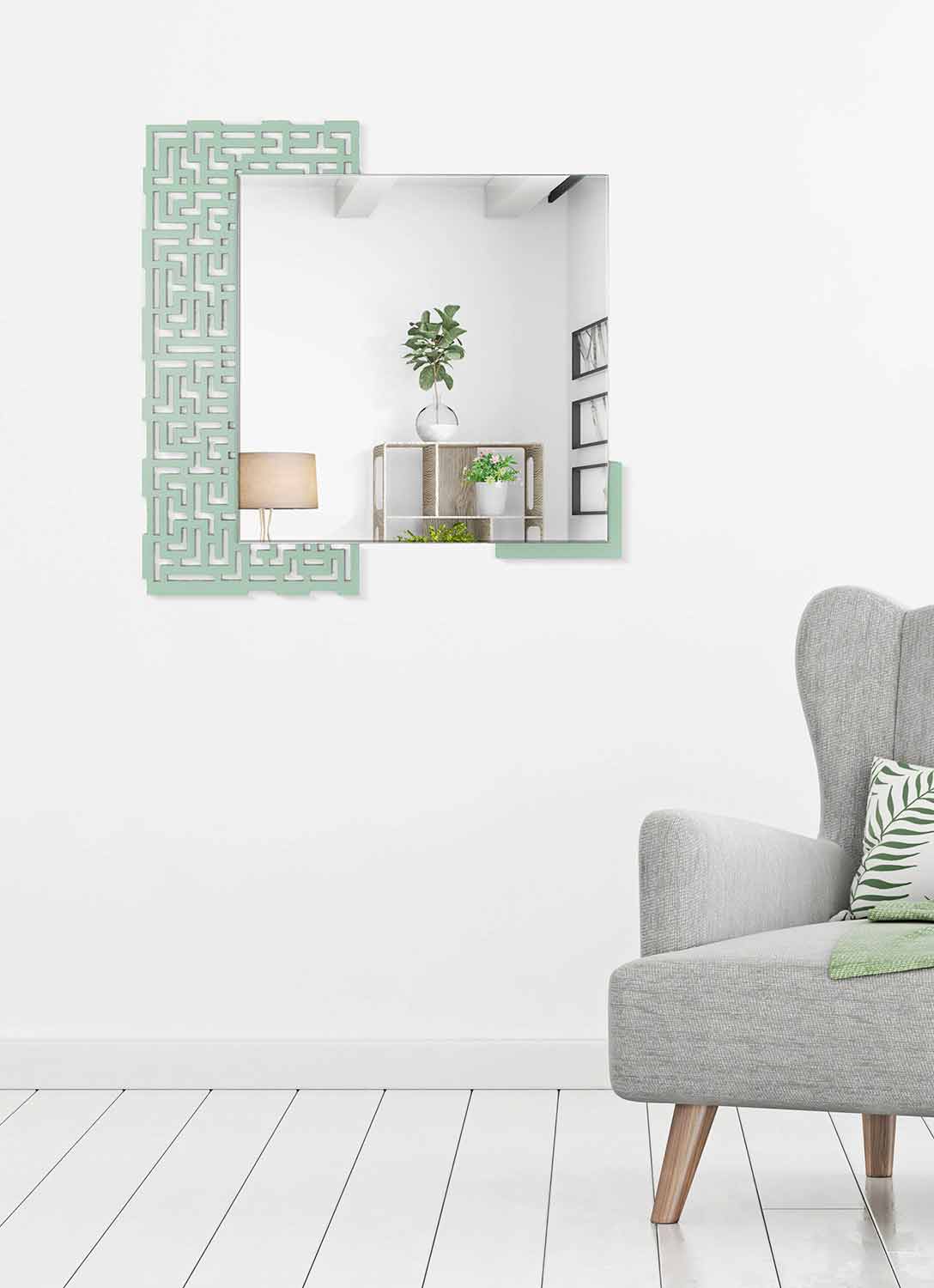Moderne vægspejl, firkantet geometrisk design, i grønt træ og lavet i Italien.