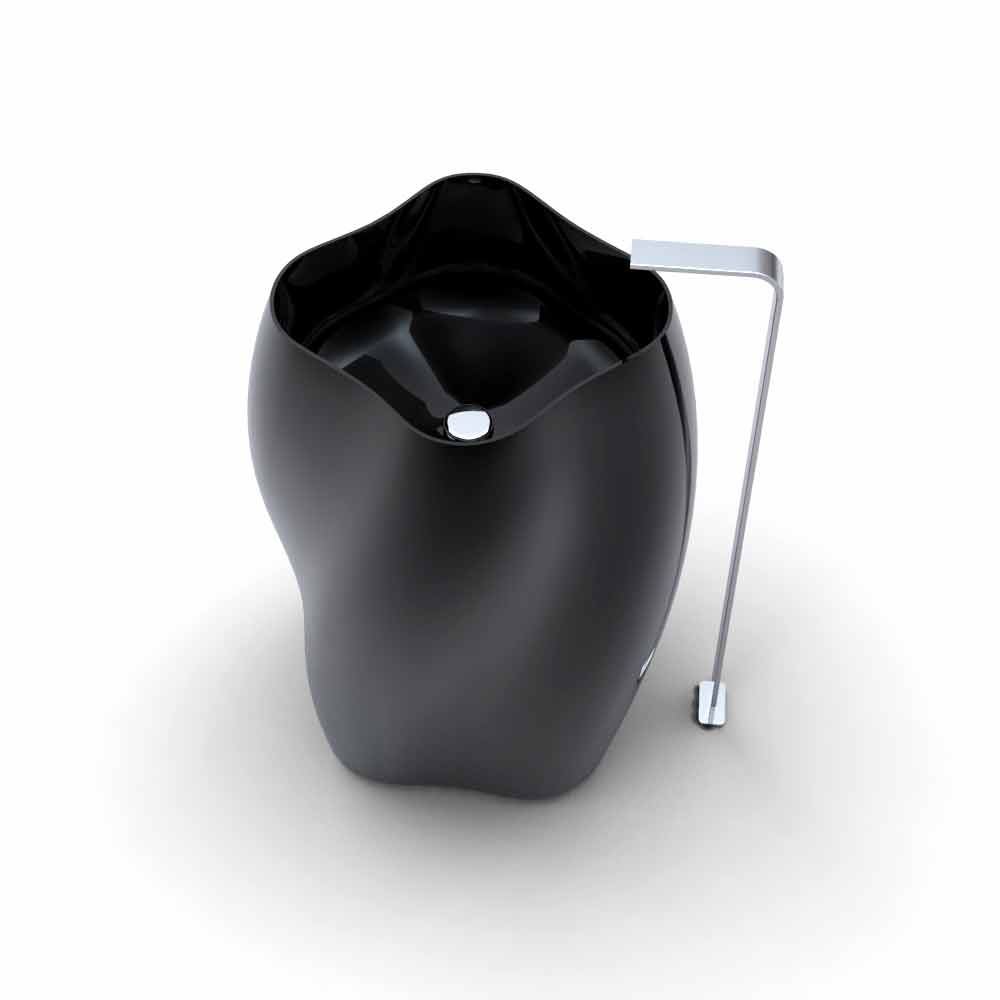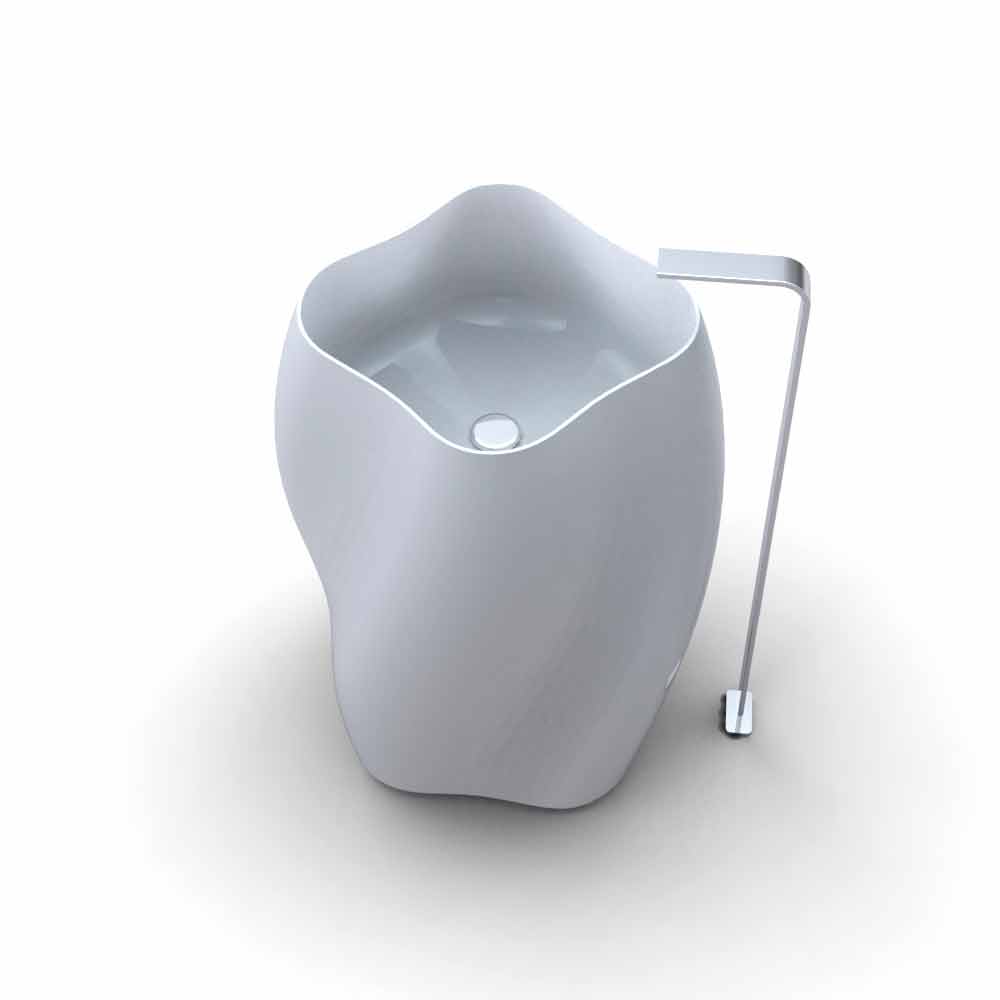 Fritstående håndvask med slyngede og organiske former, i Solid Surface; Dens linjer viser en profil, der minder om silhuetten af en "eksotisk" blomst. Ud over den "bølgede" sideprofil har den en let "snoet" form på sig selv, slank mod toppen for at vise et enkelt firsidet bassin med flige. Sidstnævnte præsenterer sig selv som et yderligere element af karakterisering og en grundlæggende geometrisk figur, der genererer hele kompositionen. Sanitetsartiklerne har også god ergonomi, da det er ret afrundet, fås i to forskellige farvevarianter: Hvid (RAL9003) eller Sort (RAL9005).
