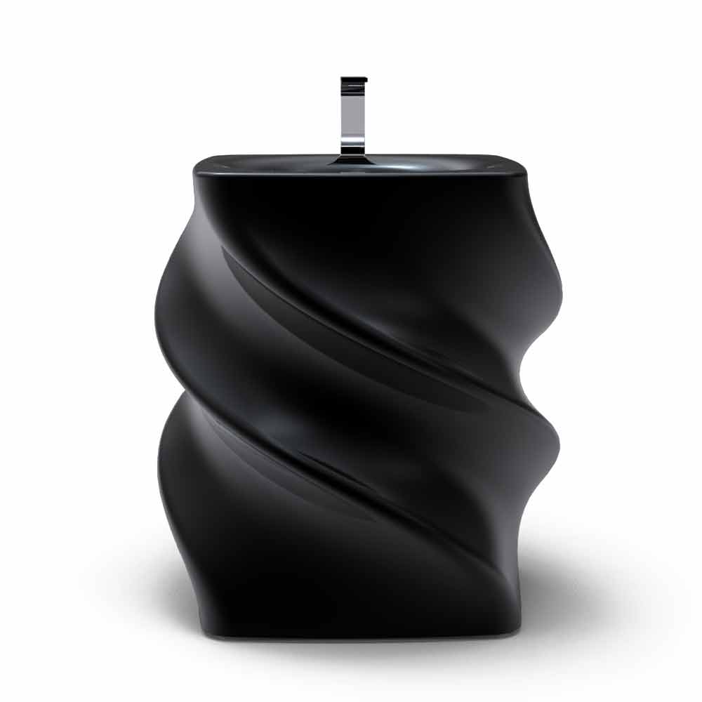 Fritstående håndvask med "skruede" former i Solid Surface; Dens omsluttende linjer viser en profil, der leder tankerne hen på "twisningen" af gevindet på en skrue, hvorfra den har sit navn på engelsk, "Twist". Dens karakteristika er en "bølget" profil og en let "snoet" form på sig selv, der kommer fra flere drejninger eller rotationer lavet i torsion af et fast stof med en firkantet base, hvilket dog annullerer denne egenskab i den indledende og terminale del. Sanitetsarmaturen har en halvkugleformet kumme med flade dele, der berører den, velegnet til at placere alt, der kan bruges til toilettet. Den er desuden ergonomisk, da den under alle omstændigheder er afrundet i delene med synligt gevind. Karakteriseret ved en blank/mat sort finish (RAL9005), som giver den en vis elegance.