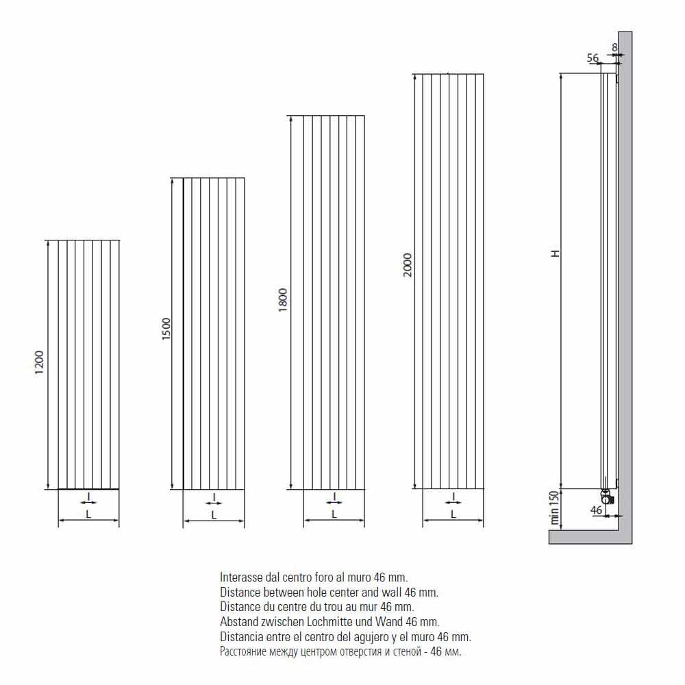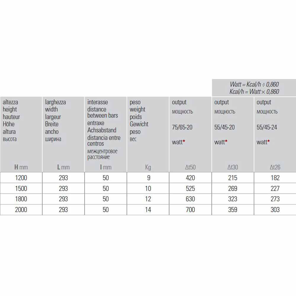 Fås i forskellige størrelser *:- H 1200 x L 293 x Inter. 50 mm x Output w (Δt50 *) 420; Udbytte w (At30 *) 215; Udbytte w (A26 *) 182;