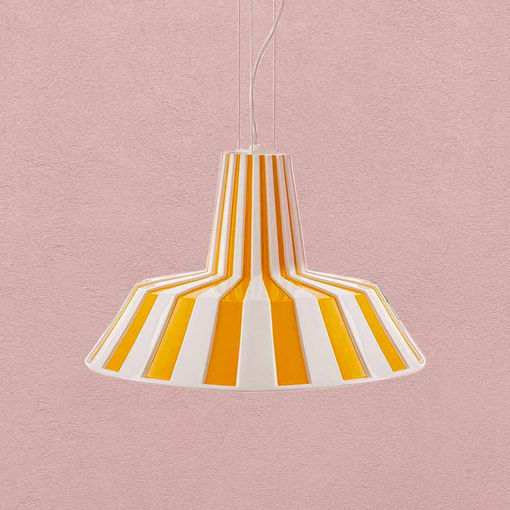 Denne lampes design er moderne baseret på kontraster, men den har også en vag retro-følelse. Med Budin kan du give plads til din fantasi, dekorere stuen, opholdsstuen eller køkkenet med lyspunkter i levende og originale farver. Den er lavet i Italien og er lavet af keramik i en tofarvet finish. Den er også udstyret med en reflekterende indvendig parabel og støttekabler i rustfrit stål, der muliggør højdejustering på installationstidspunktet.