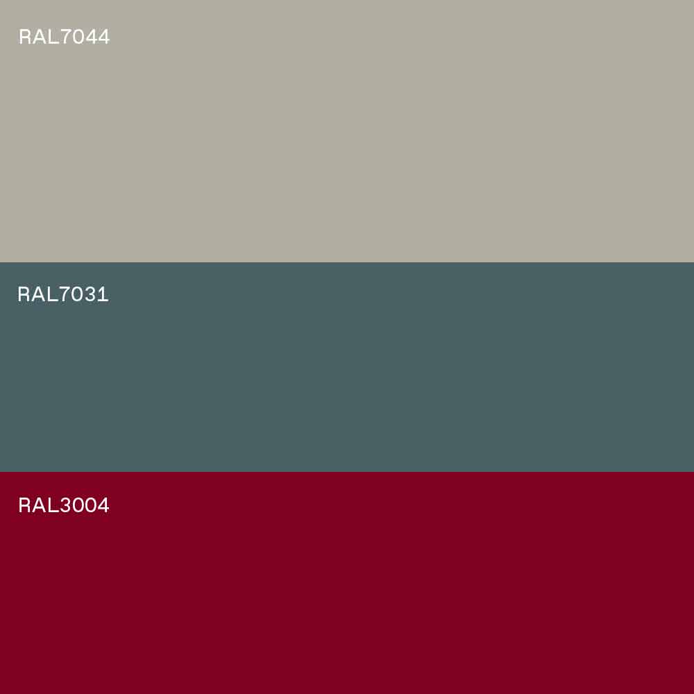 - ben i grå RAL7031 + bordeaux kryds RAL3004 + top i duegrå RAL7044