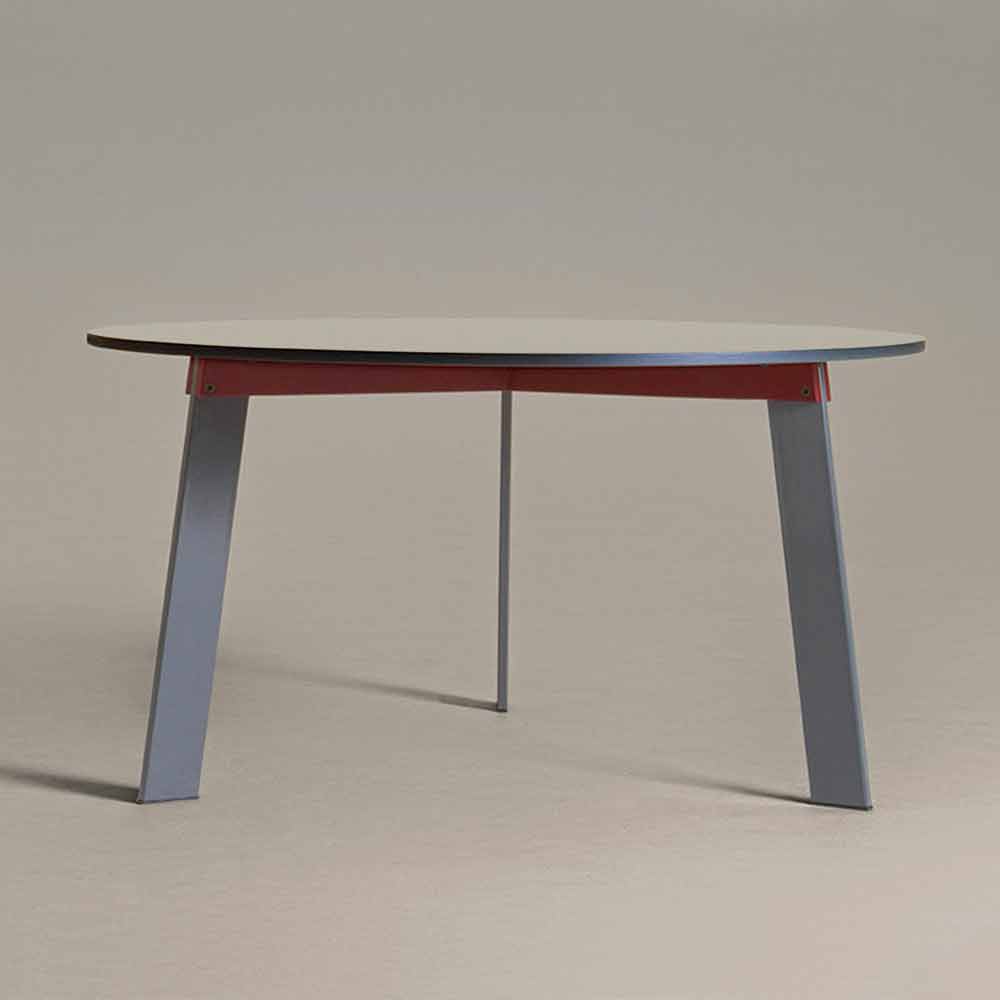 Moderne rundt stålbord med krydsstruktur og MDF-plade, farverigt design lavet i Italien.