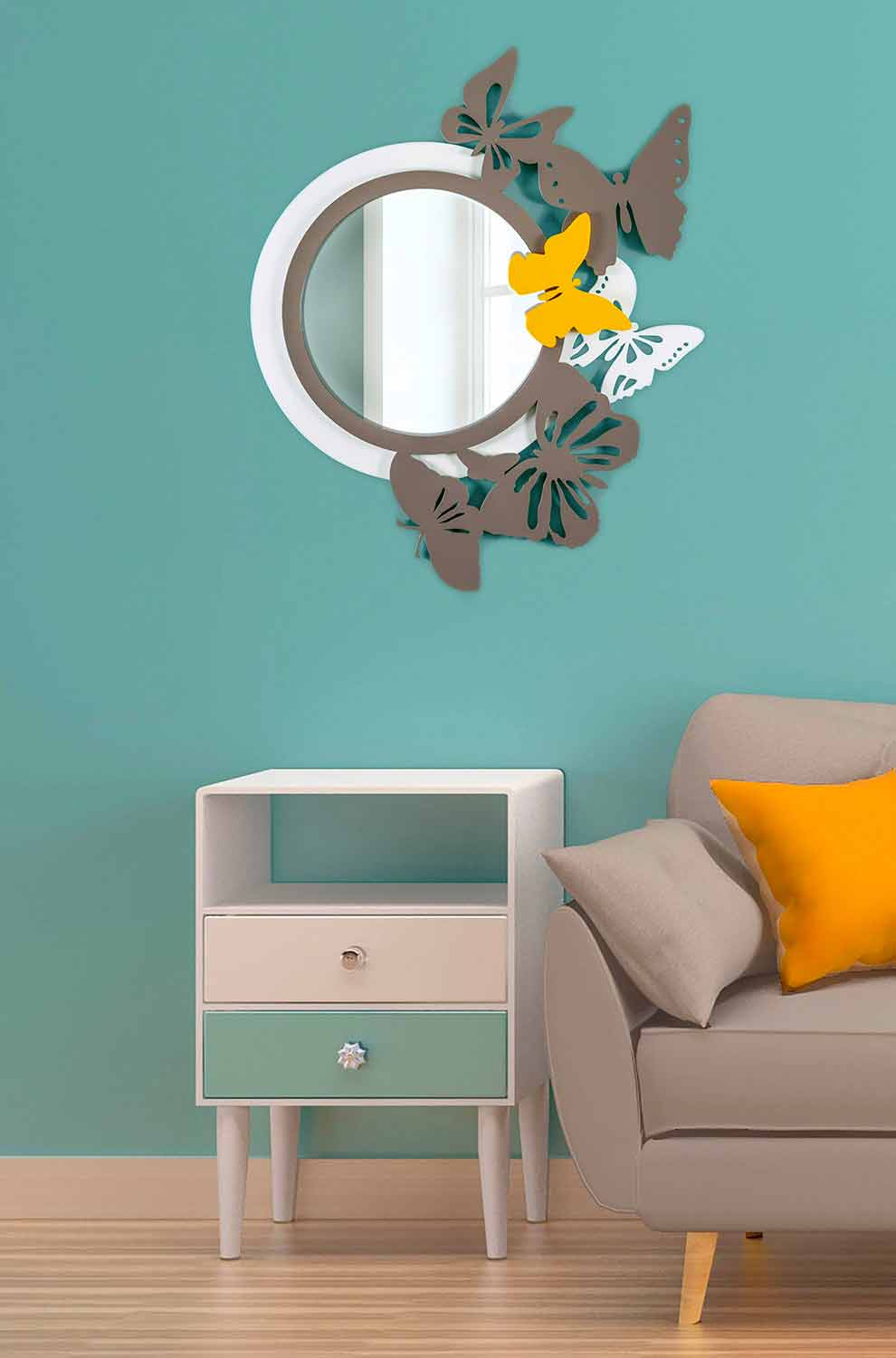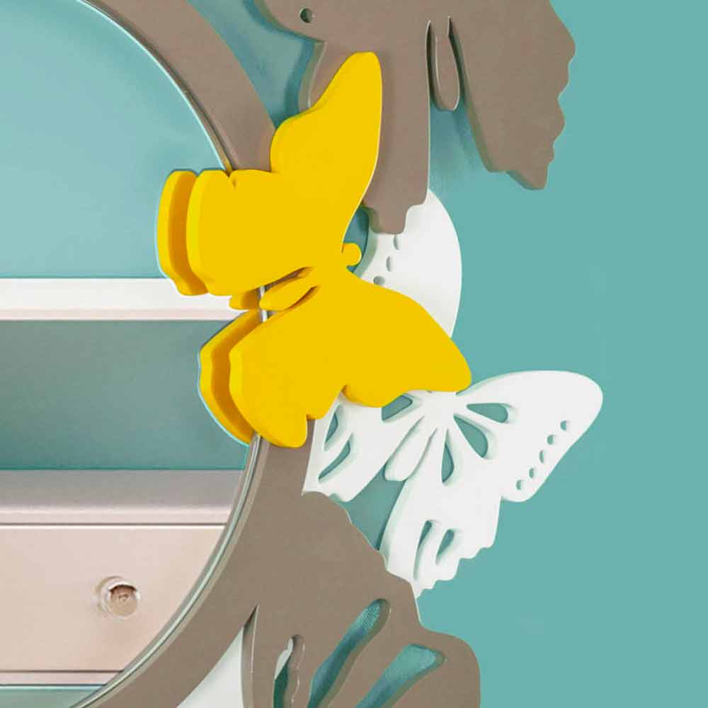 Moderne og rundt vægspejl, i farvet træ med dekorative sommerfugle, lavet i italiensk design.