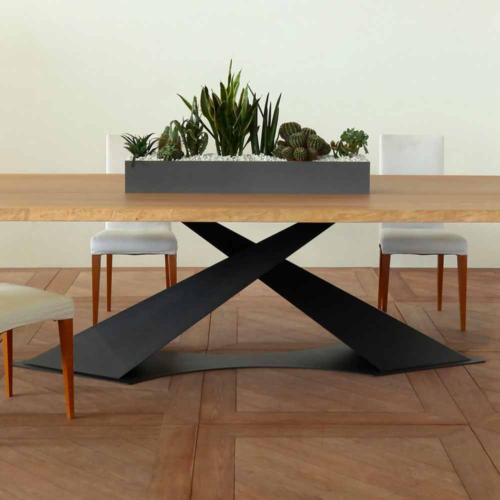 Elliotbordet er kendetegnet ved en børstet massiv egetræplade med en barkkant, malet med naturlig virkning og en anti-rids vandbaseret maling med særpræg af at give en ekstraordinær tabelleffekt uden risiko for deformation og revner i fast træ og støtten centralt metal, med elementer hældende og krydsede asymmetrisk.