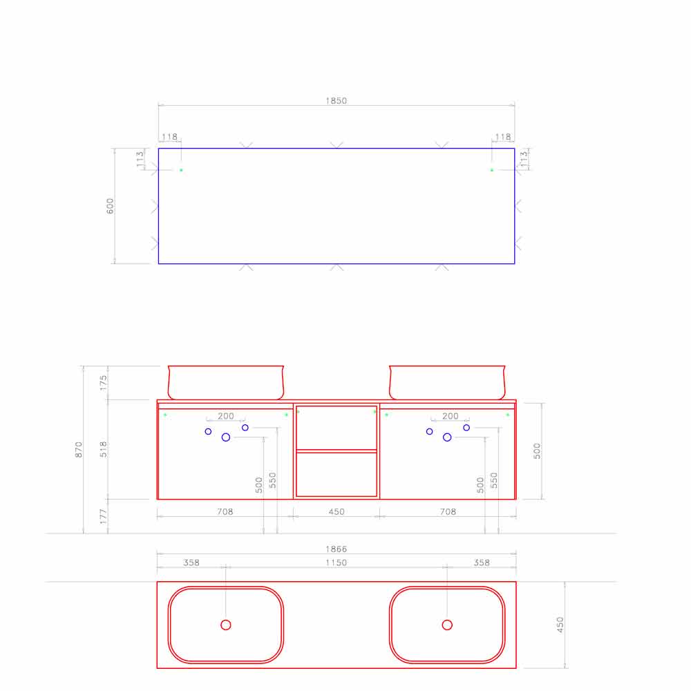 Det er en moderne og symmetrisk komposition, designet med en dobbelt vask og væggenhed adskilt af en åben hylde, der holder designet rent og pænt.
