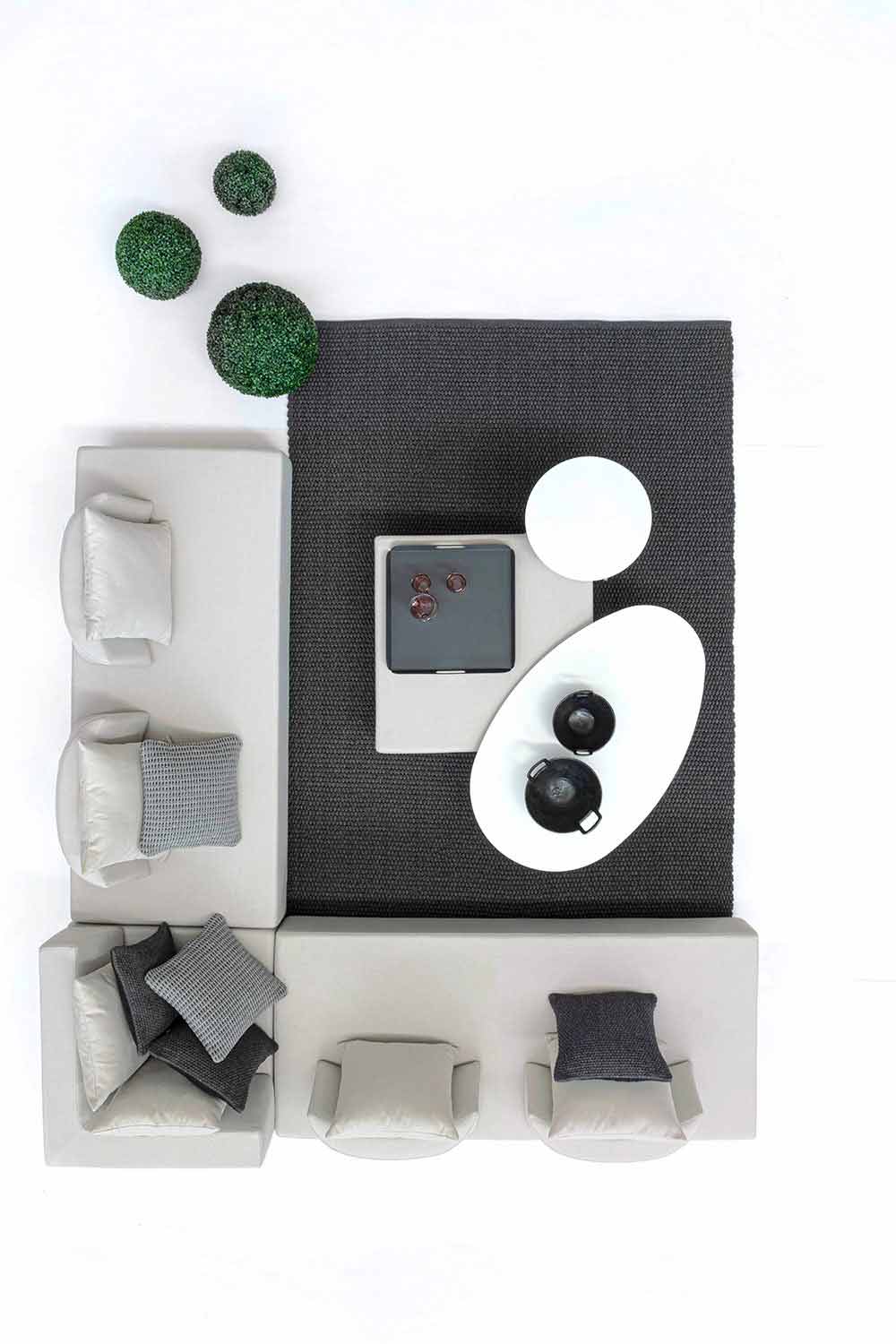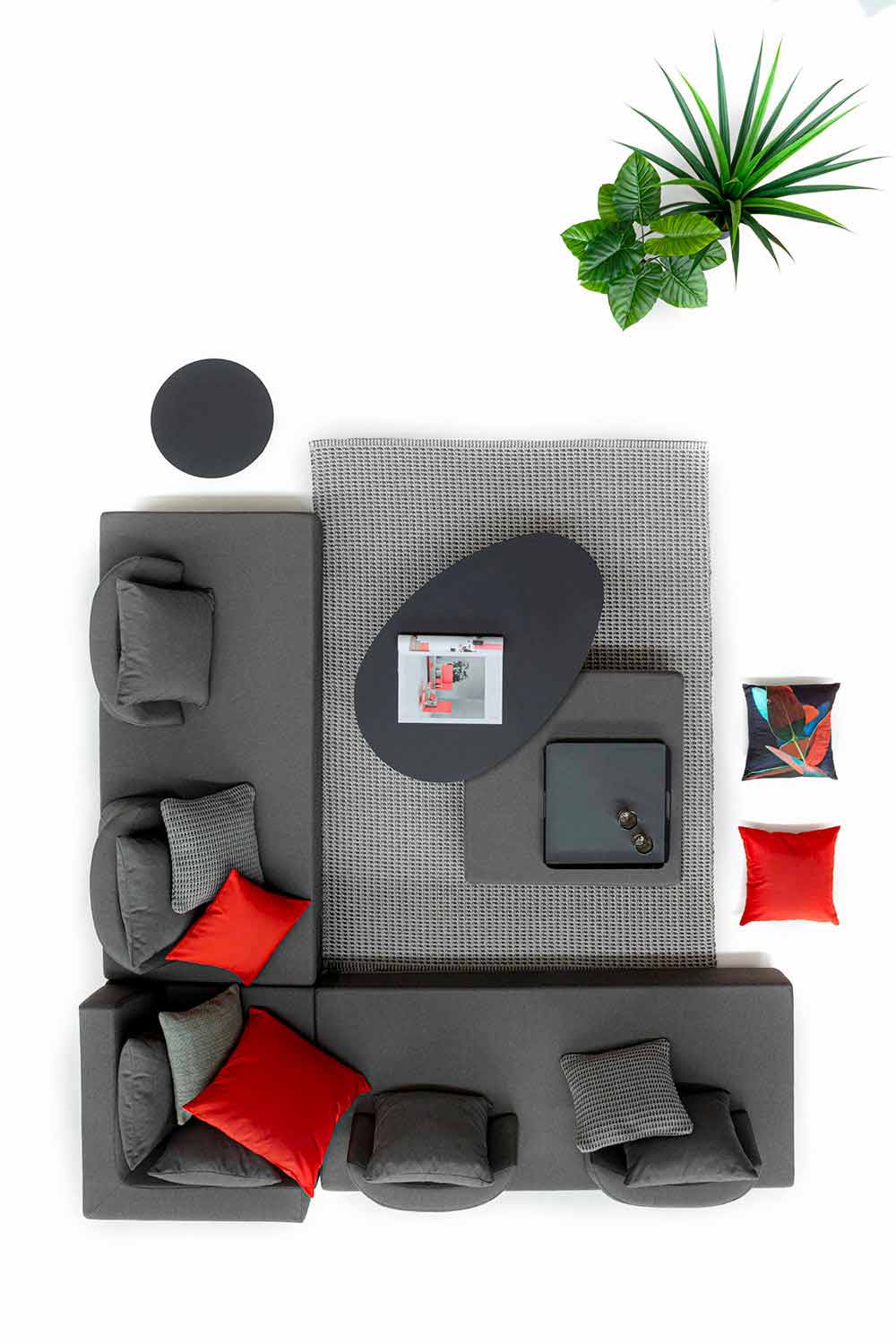Sammensætning af sofaer og fænomener med aluminiumsstruktur; aftagelige ryg med stålkonstruktion, varmgalvaniseret og pulverlakeret (polyester).