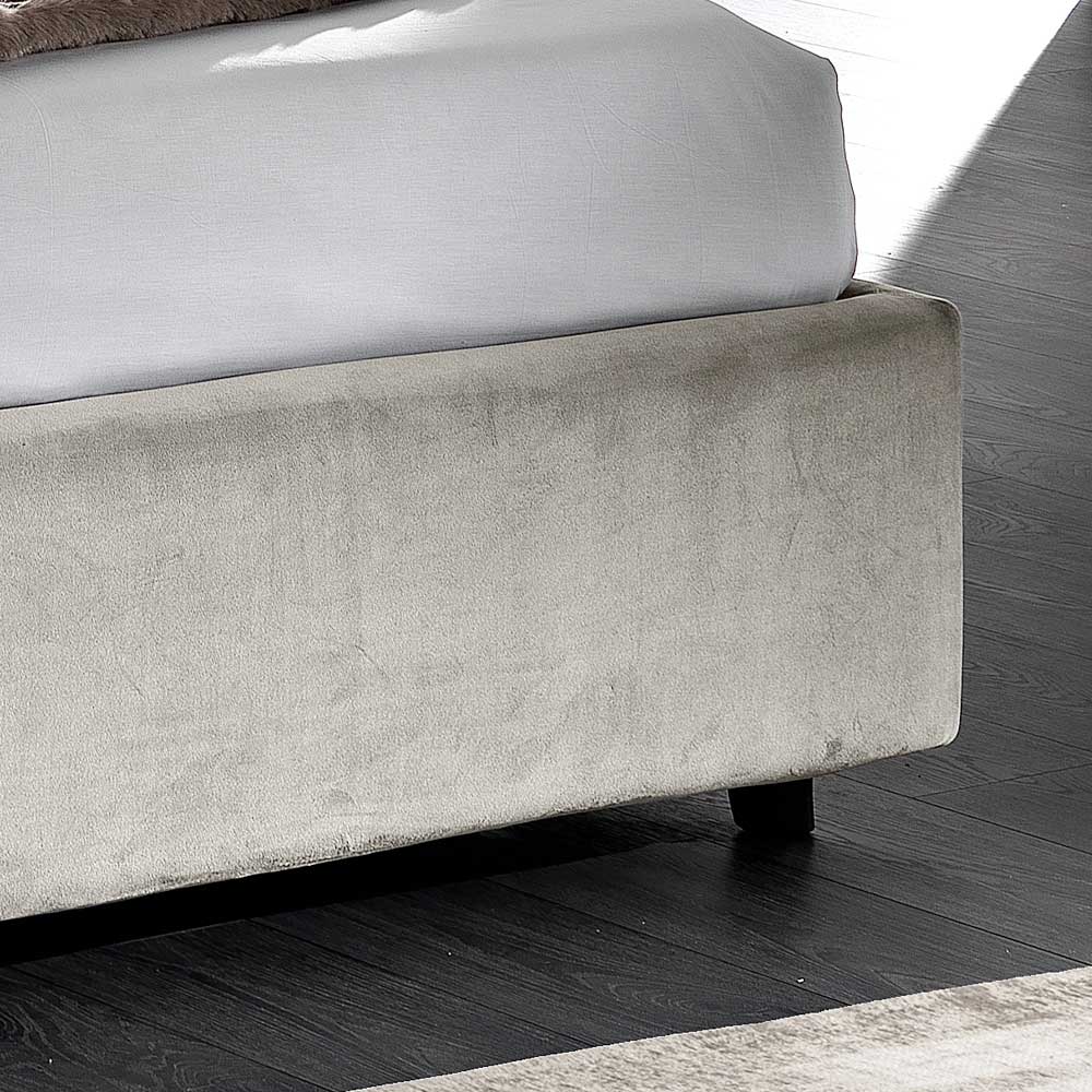 - Sengegavl: Element 1 Quiltet fløjl col. 31 lysegrå - Element 2 og sengeramme Glat fløjl col. 34 vulkan