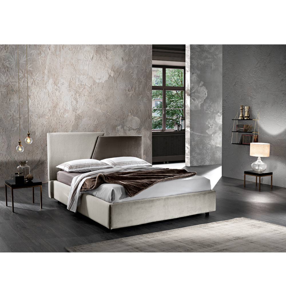 Dobbeltsengen udmærker sig ved sit design bestående af diagonale linjer og afgørende former, der minder om modernitet. Den tilpasser sig enhver kontekst og indretningsstil takket være muligheden for at kombinere to forskellige nuancer af forskellige stoffer, hvilket gør den unik og nem at kombinere.