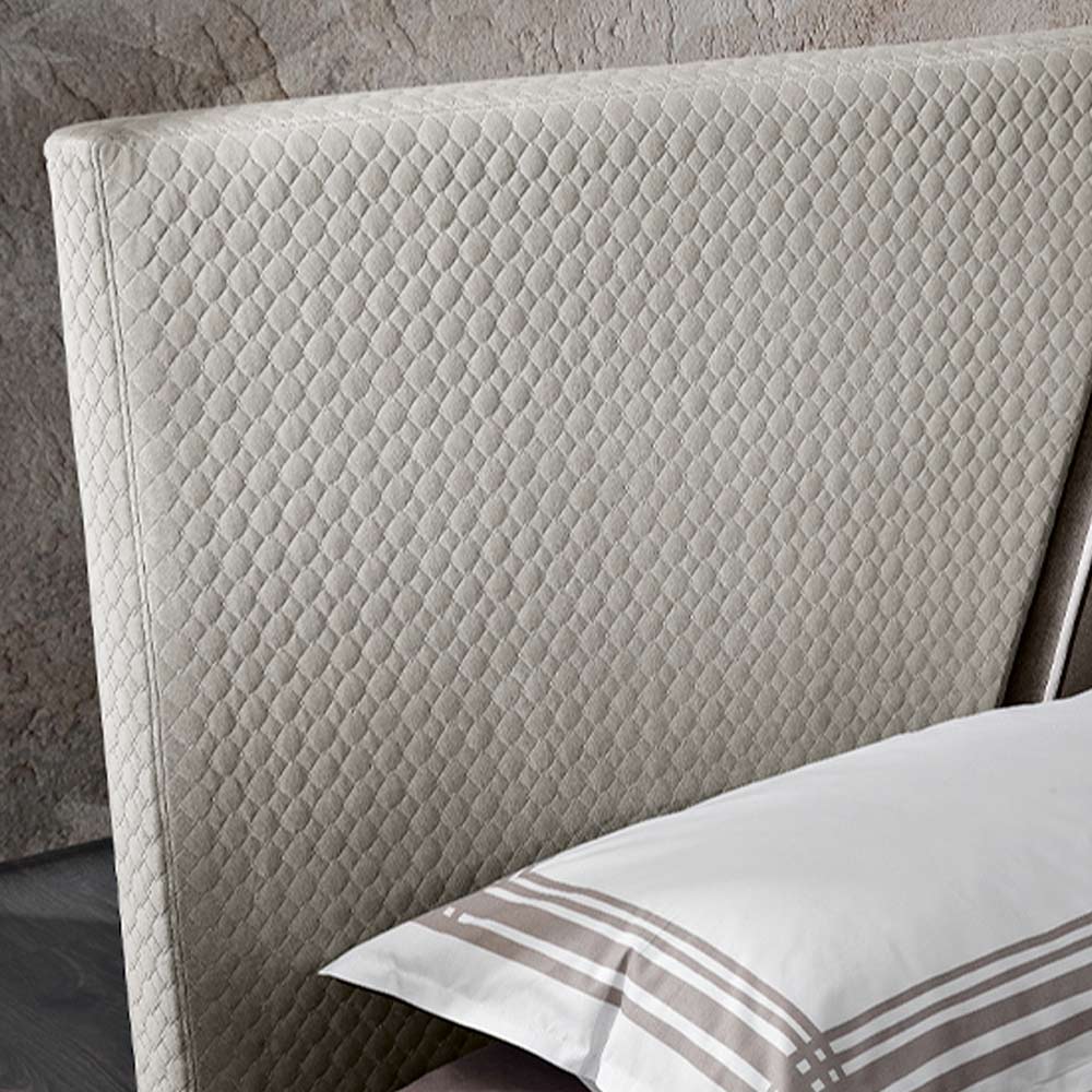 Moderne dobbeltseng med sengegavl i to stoffer, lavet i italiensk design.