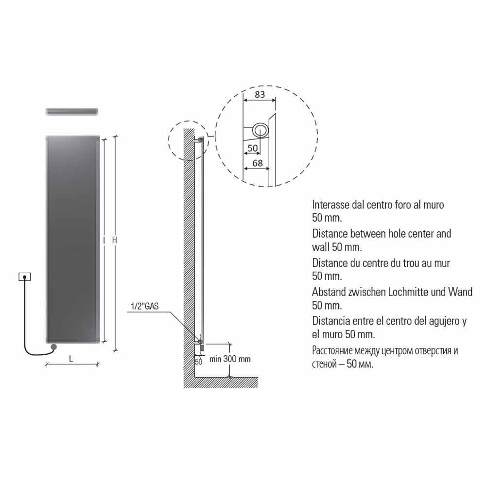 Elektrisk designradiator i lodret stål til væginstallation, fremstillet i Italien.
