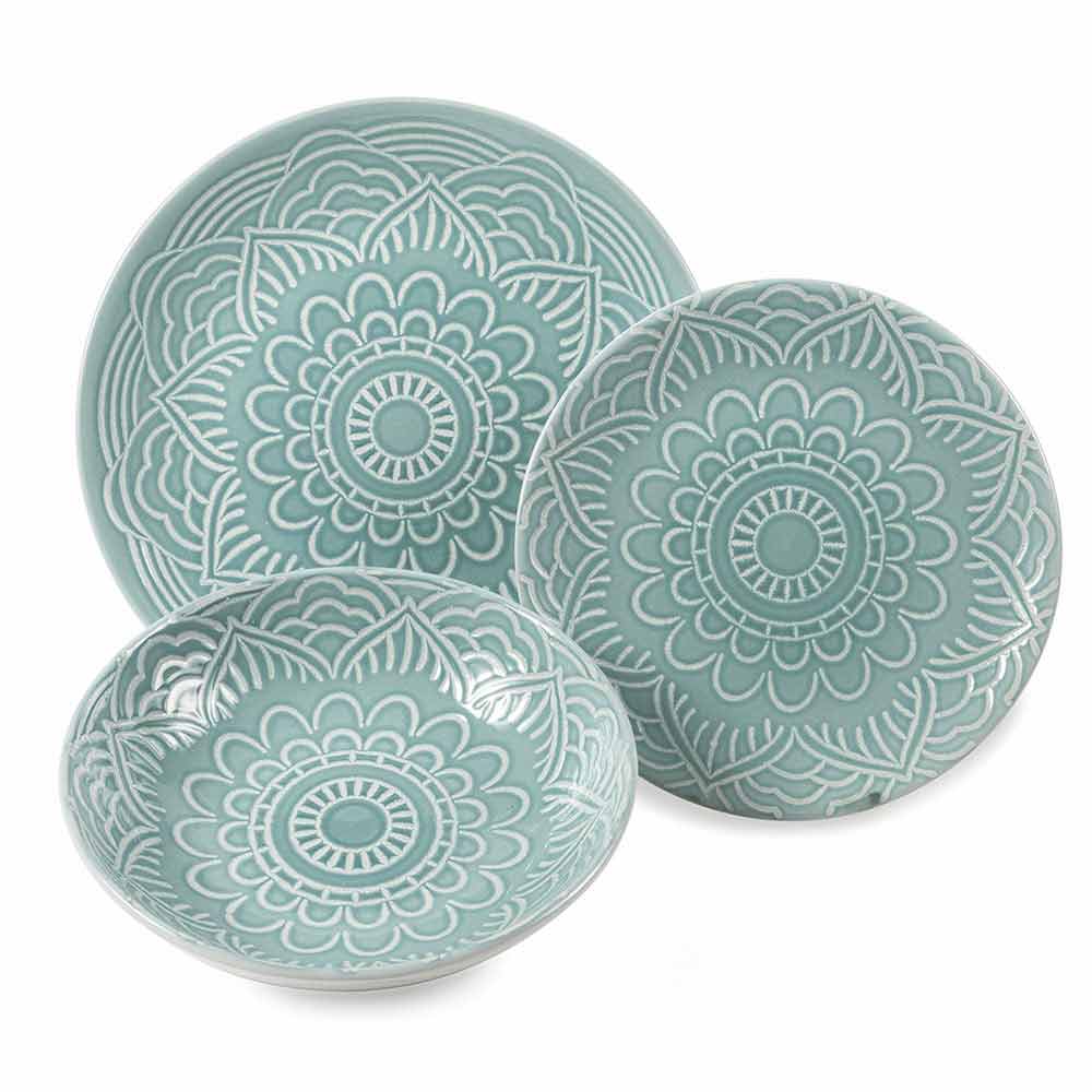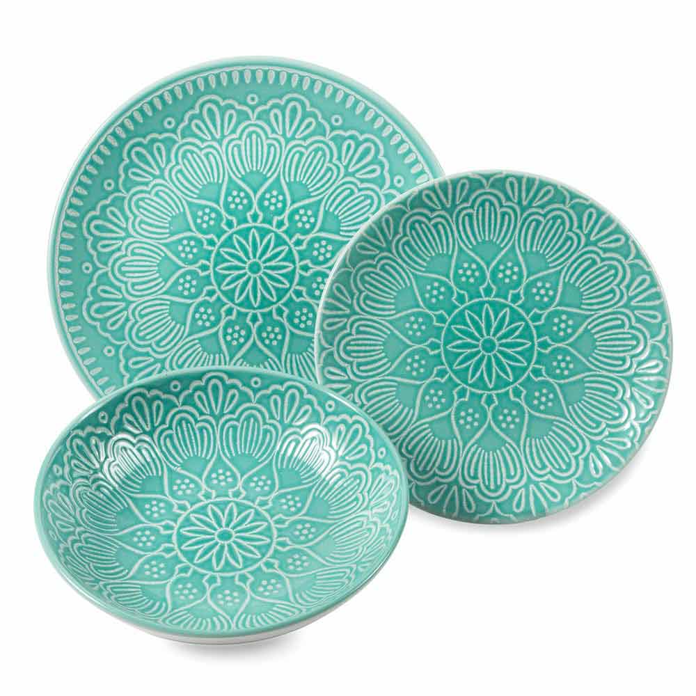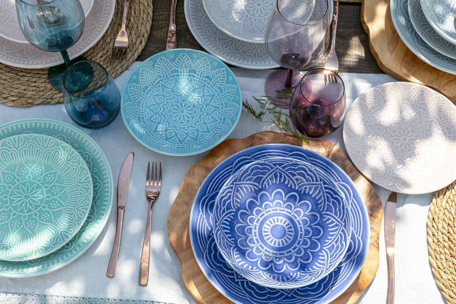 Sæt med farvede og moderne stentøjsretter komplet med 18-deligt designsservise.