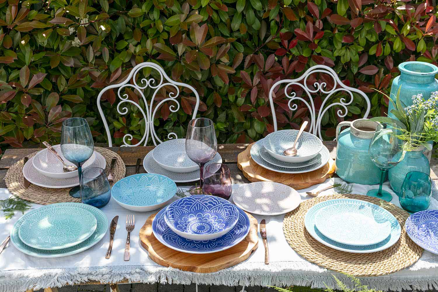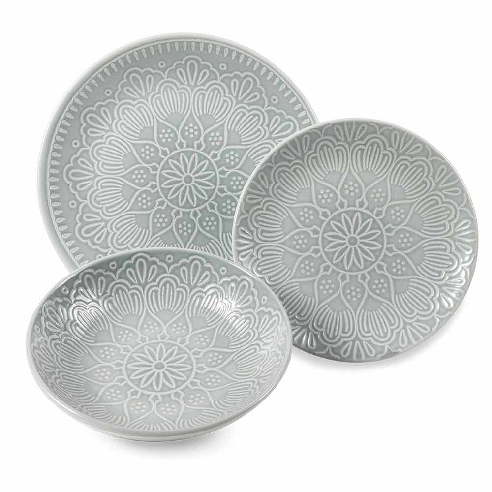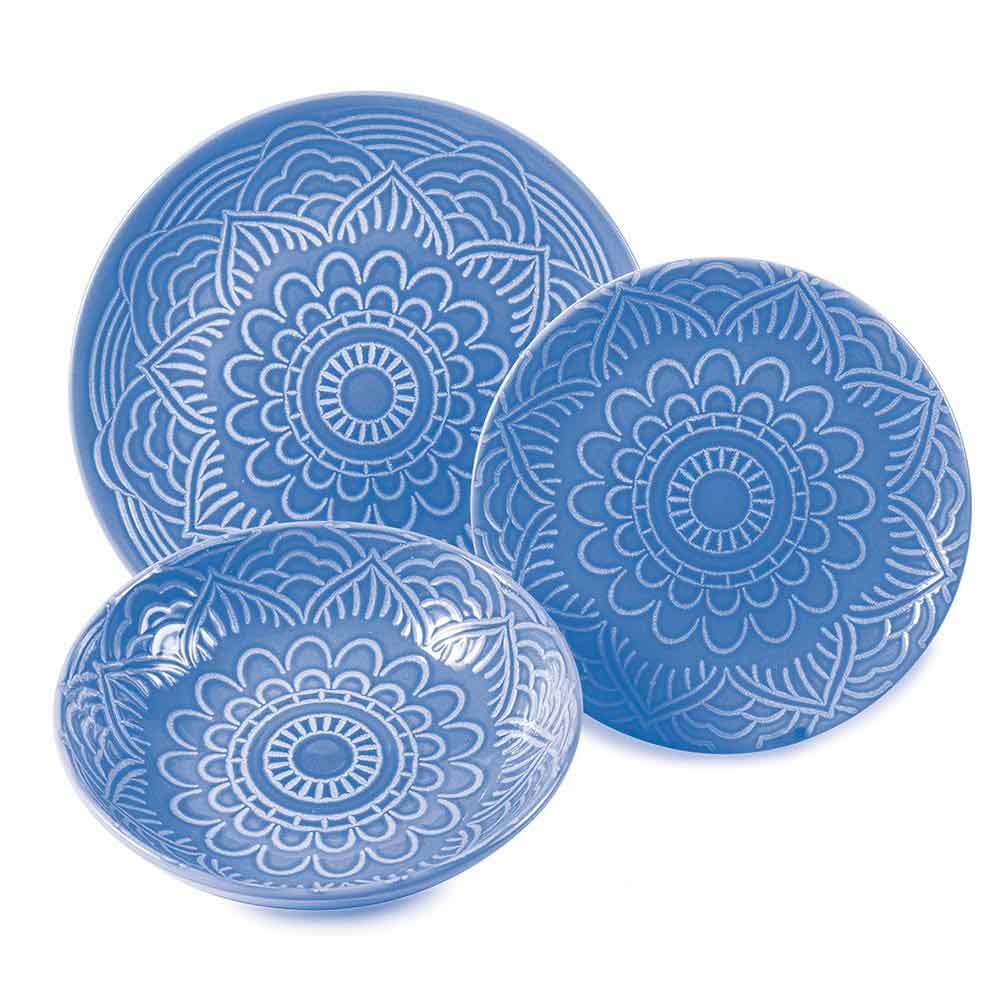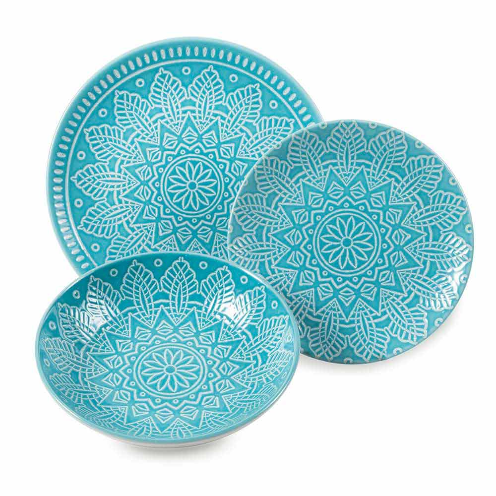 Sæt med farvede og moderne stentøjsretter komplet med 18-deligt designsservise.