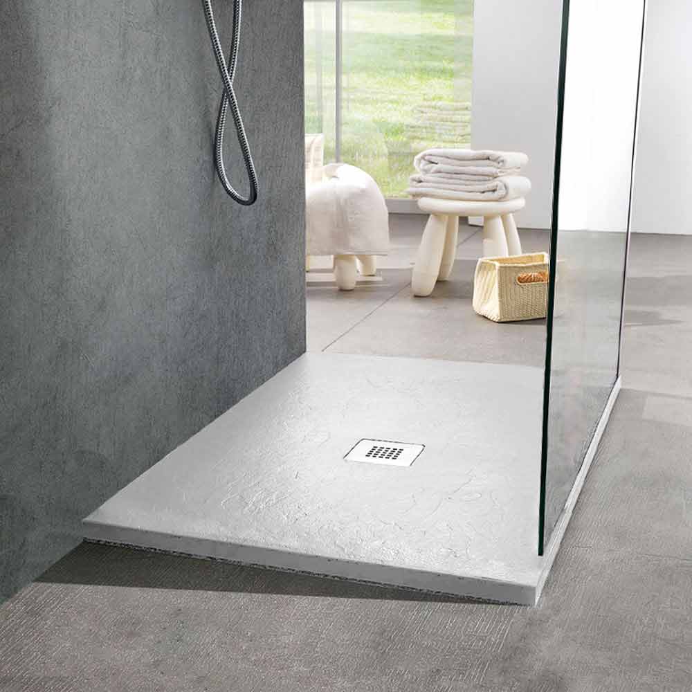 Firkantet brusebad 90x90 i hvid harpiks med stålrist.