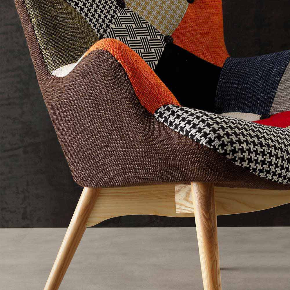 Flerfarvede patchwork lænestole Veronica, ben i massivt træ. Moderne lænestol. Veronica har træben lavet af ask, naturlig finish og flerfarvet patchwork shell.