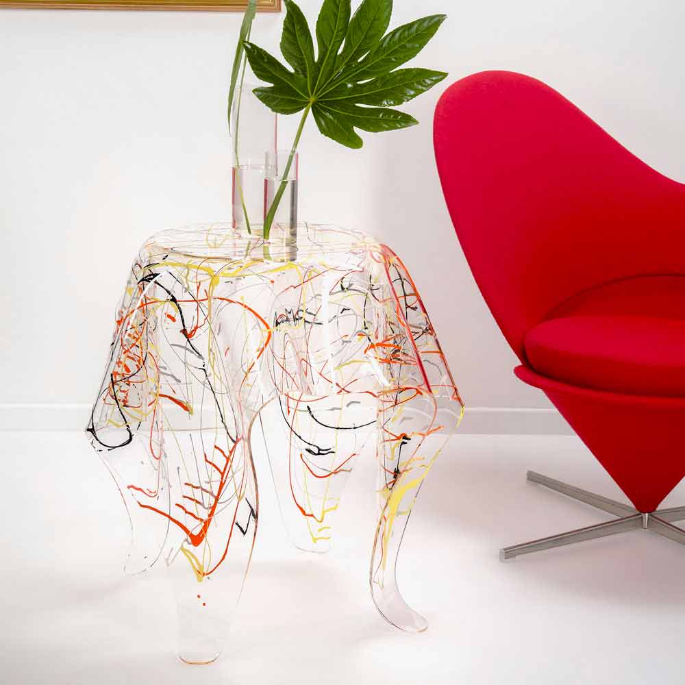 Plexiglas flerfarvet sofabord lavet i Italien, Otto Det draperede Otto bord er et unikt stykke, et værk af moderne kunst. En 100% ren polymerplade i ren PMMA plexiglas med malingssprøjtning, draperet med hånden ved høje temperaturer, for at skabe et unikt og uopretteligt bord.