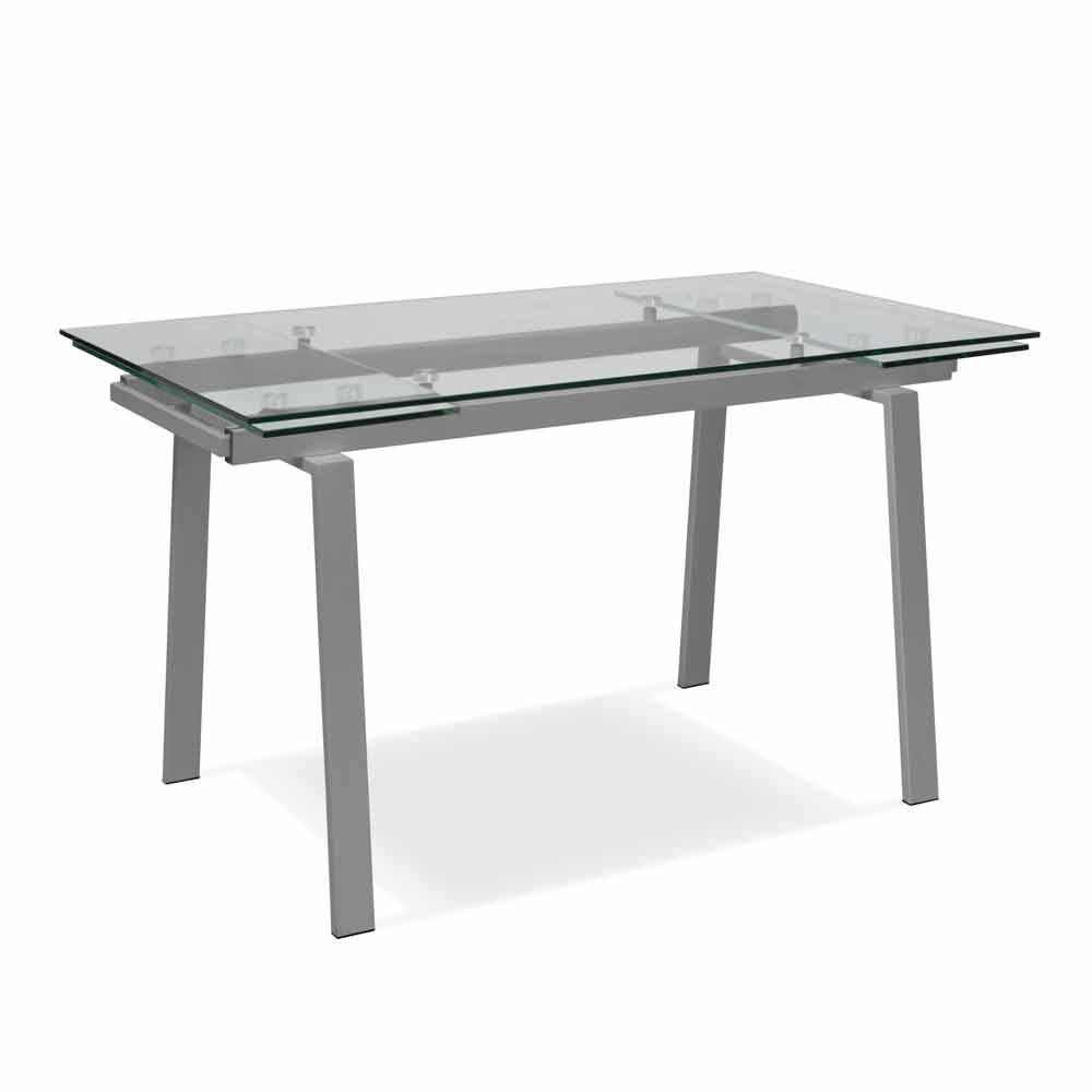 Udvideligt designbord med malet metalbase. Top og udvidelser i gennemsigtigt hærdet glas.