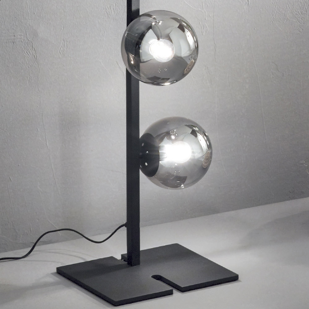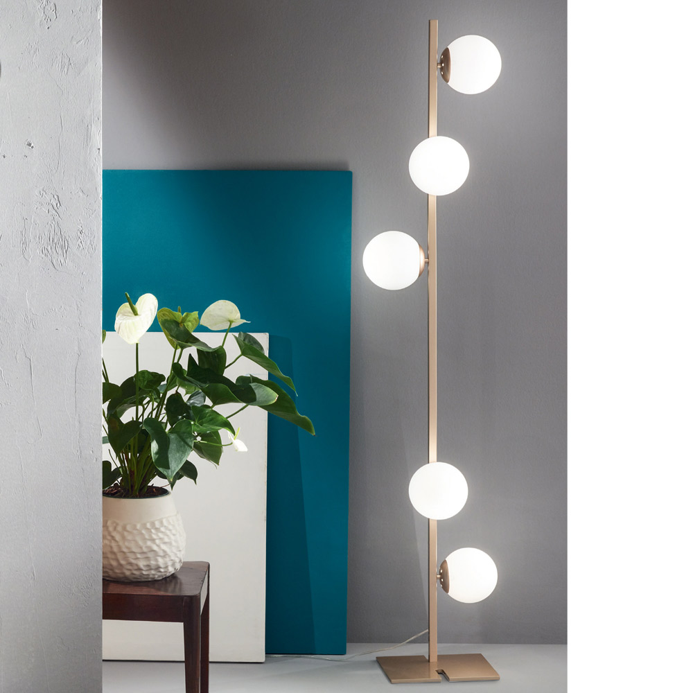 Moderne gulvlampe i blæst glas med metalstruktur.