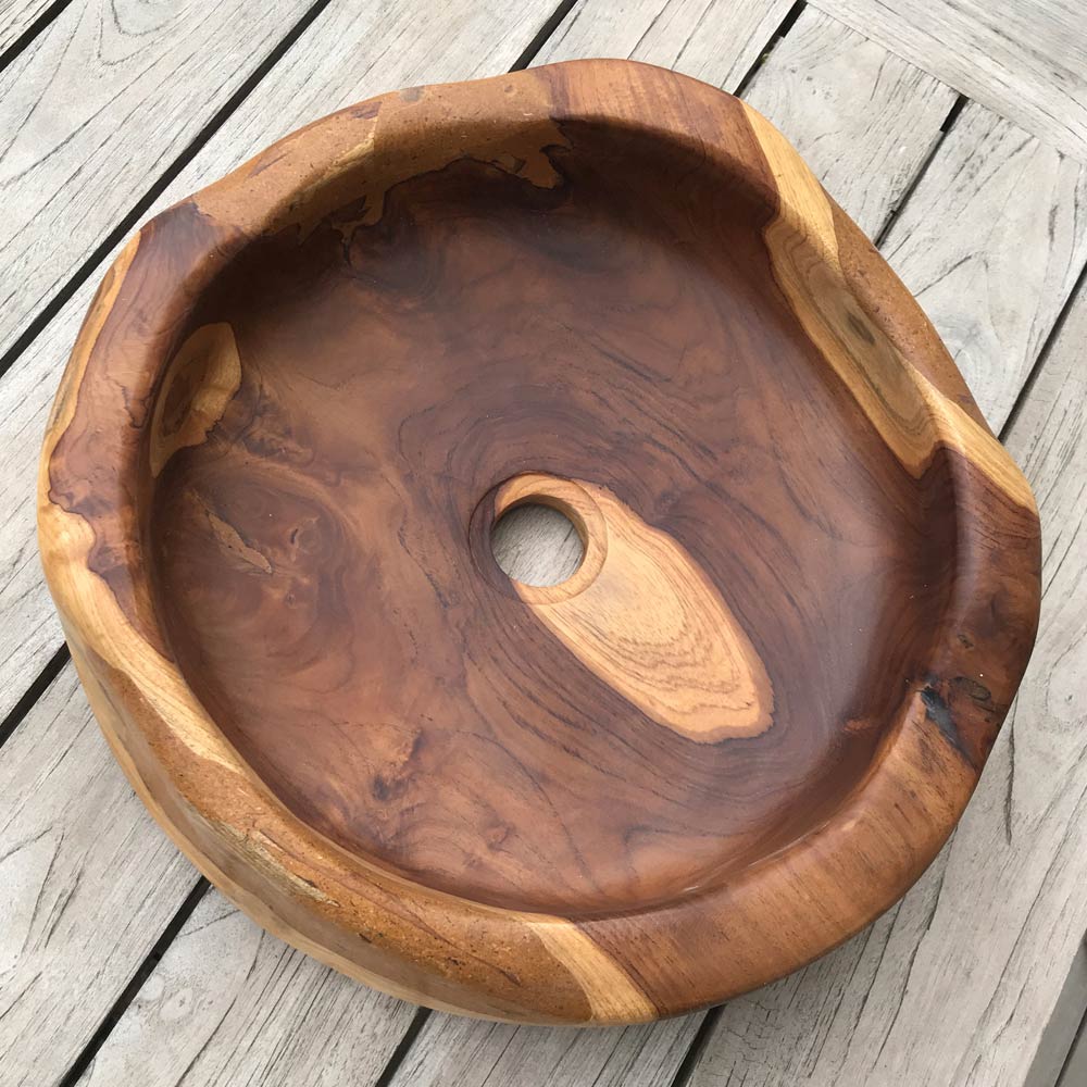 Naturlig og poleret teaktræ i en essentiel og praktisk form. Ubehandlet træ returnerer dufte og farver fra tropiske skove. Bordvask i glat og ubehandlet natur teak.