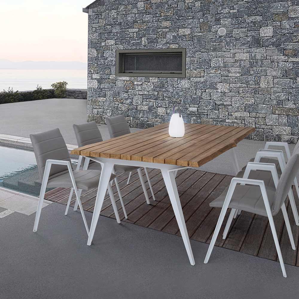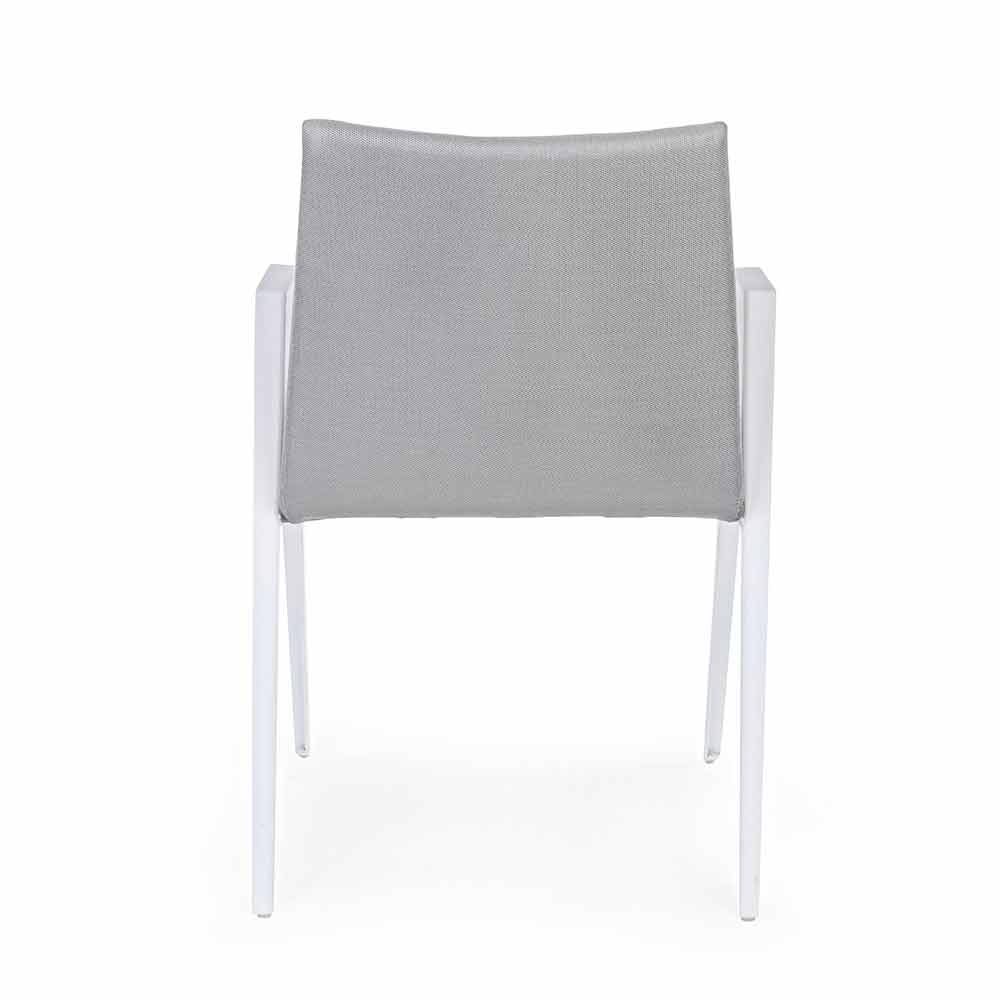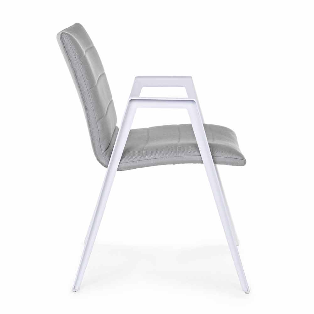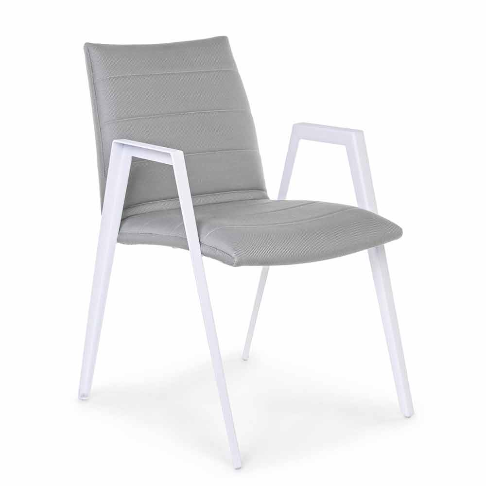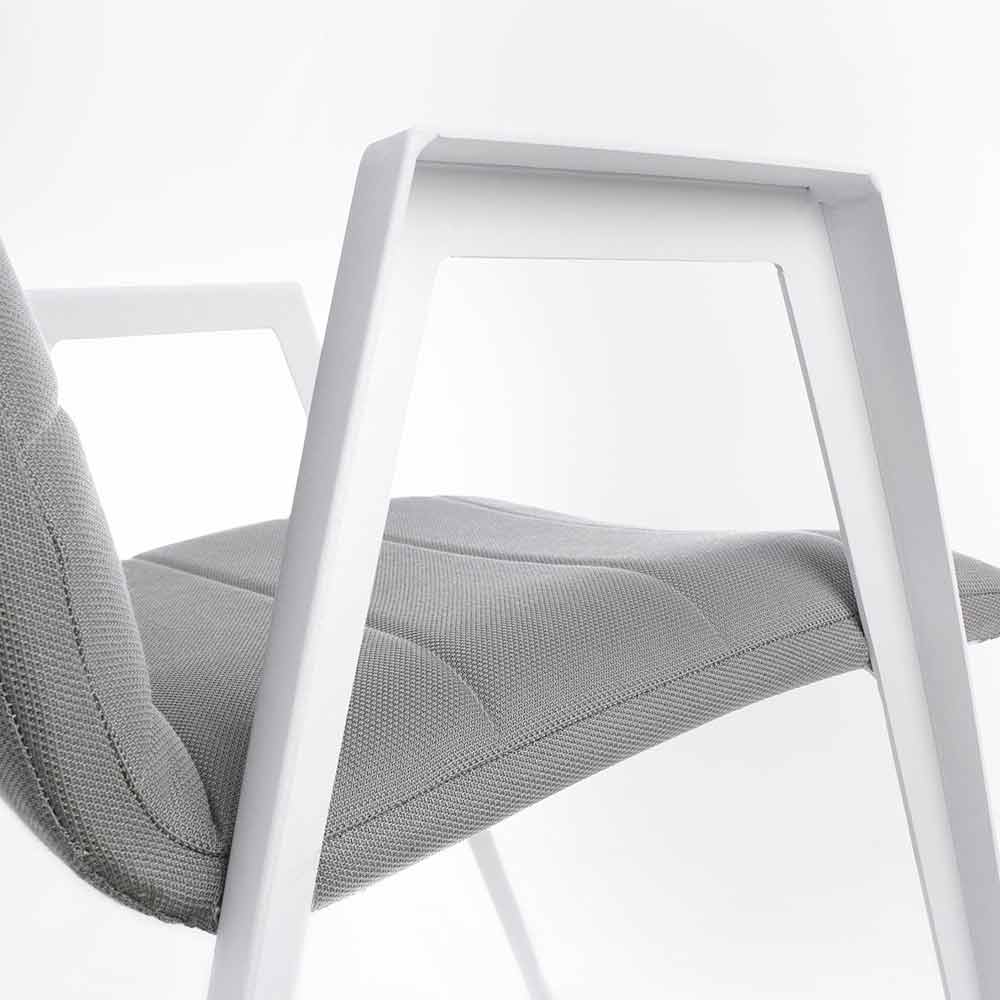 Moderne udendørs stol med armlæn, ben i hvidt aluminium og sæde og ryg i gråt tekstil.