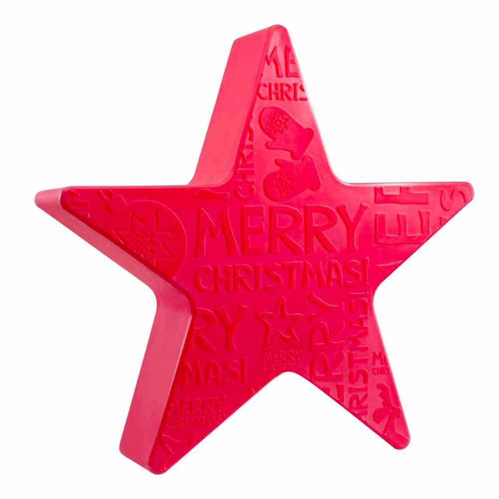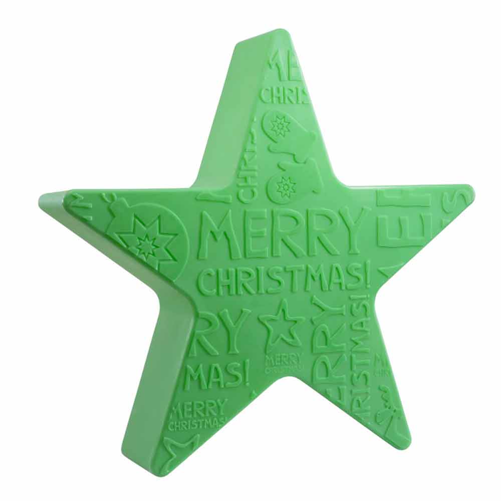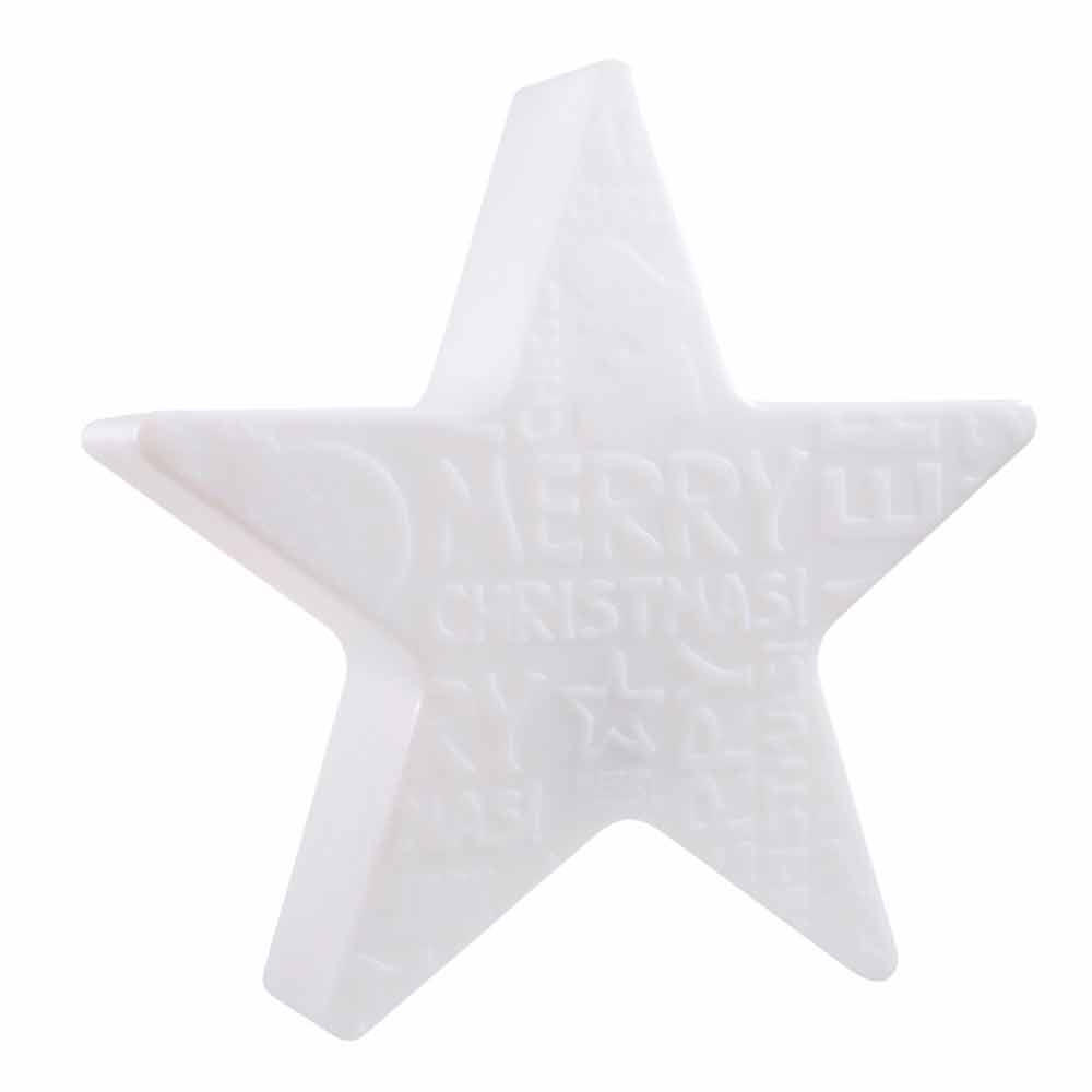 Stjerneformet gulv- eller bordlampe med præget julemotiv på den ene side lavet af polyethylen til indendørs eller udendørs brug.