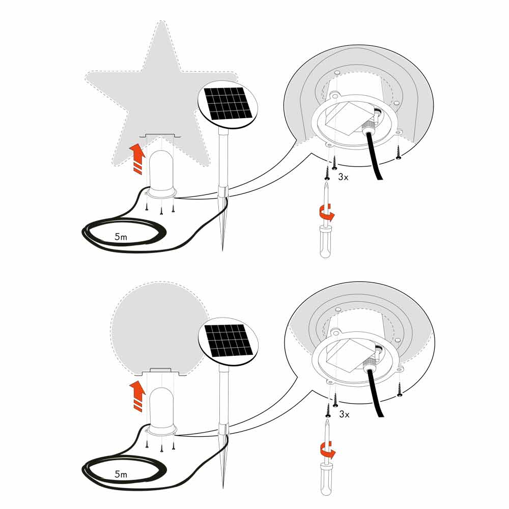 - soludstyr til udendørs brug : inkluderer et permanent installeret monokromatisk hvidt LED- belysningssystem med et eksternt solmodul med integreret batteri (1800mA), der fanger sollys om dagen og derefter omdanner det til elektricitet. Der kræves en tilstrækkelig og tilstrækkelig mængde solbelysning til korrekt opladning af lampen, som tændes uafhængigt i skumringen via en lyssensor. Dette system kræver ikke stikkontakter, hvilket beskytter miljøet. Ideel til belysning af stier, altaner og terrasser. Varighed med fuld opladning: ca. 6 timer. Strømforbrug: 2 watt, temperatur: varm hvid 3000K, sort kabel 5m.