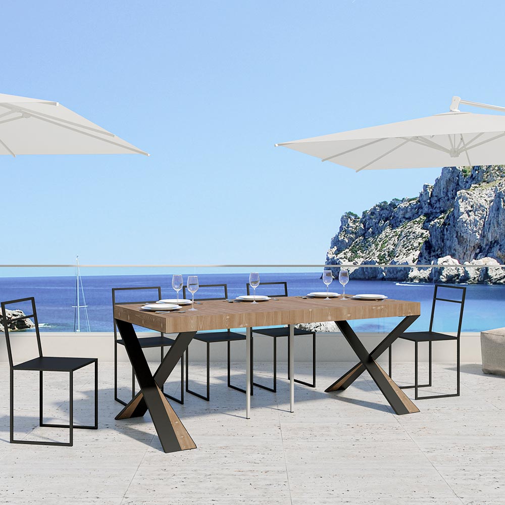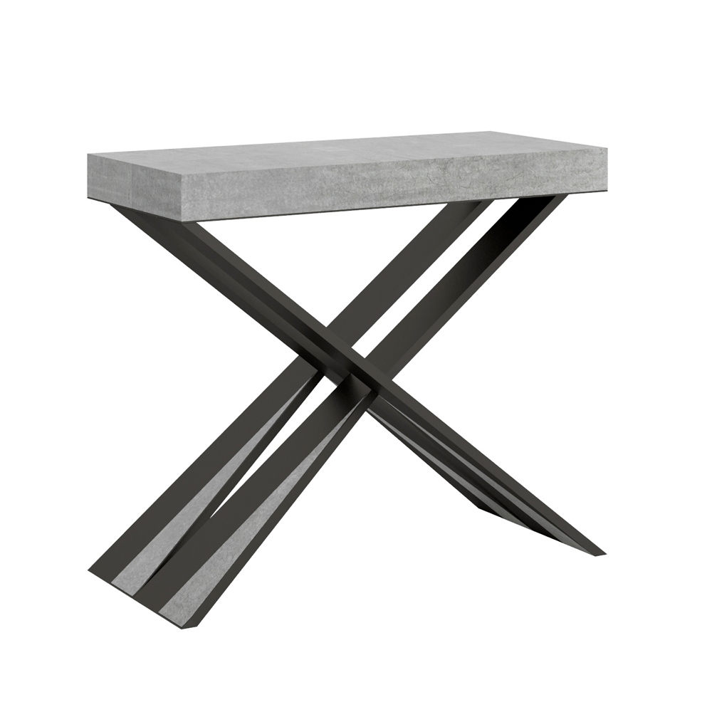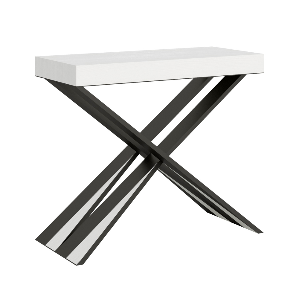 Dette udtrækkelige konsolbord kombinerer elegance og funktionalitet i et iøjnefaldende design. Det har en moderne silhuet med en X base, der ikke kun giver solid støtte, men også tilføjer et strejf af sofistikeret originalitet. Toppen i møbleret træè en hyldest til kvaliteten af Made in Italy, der er værdsat for sin holdbarhed og evne til at modstå tidens gang.