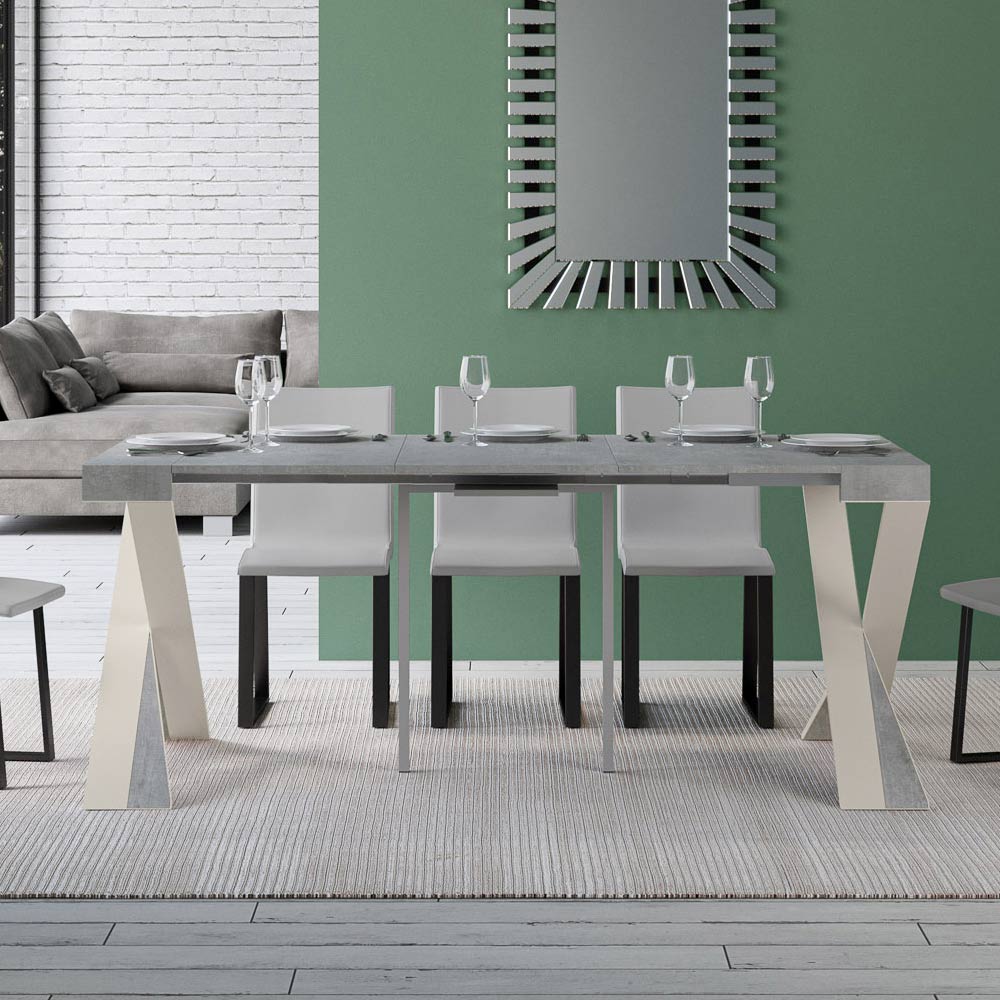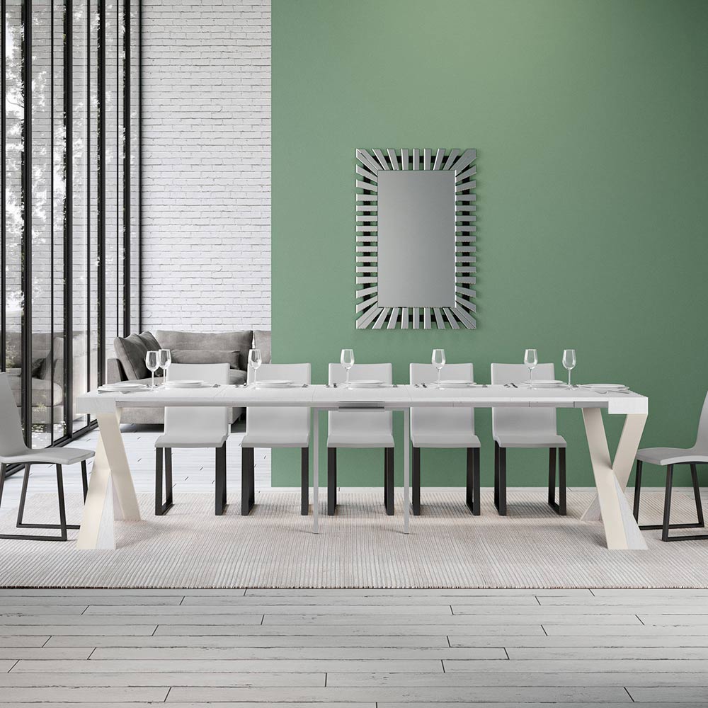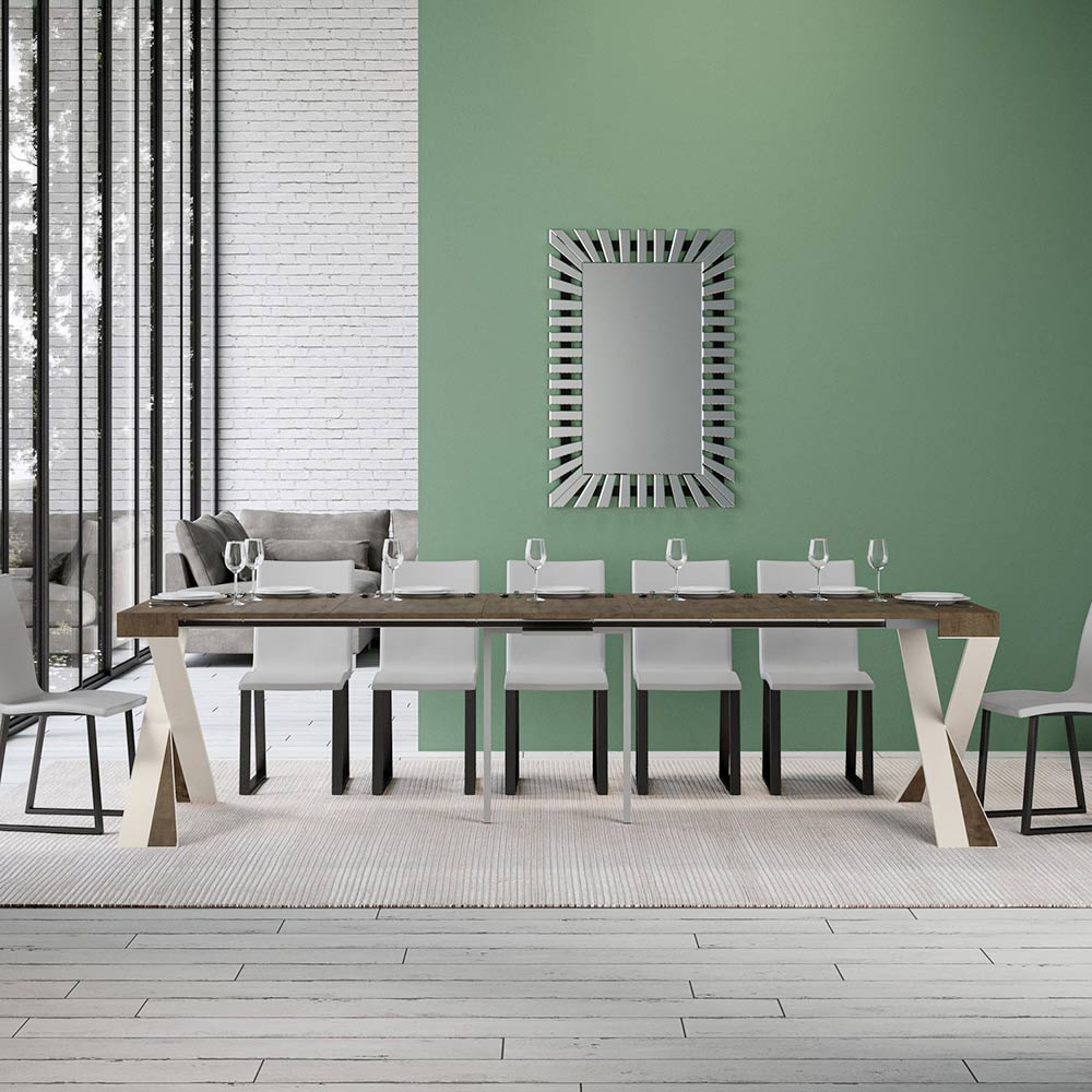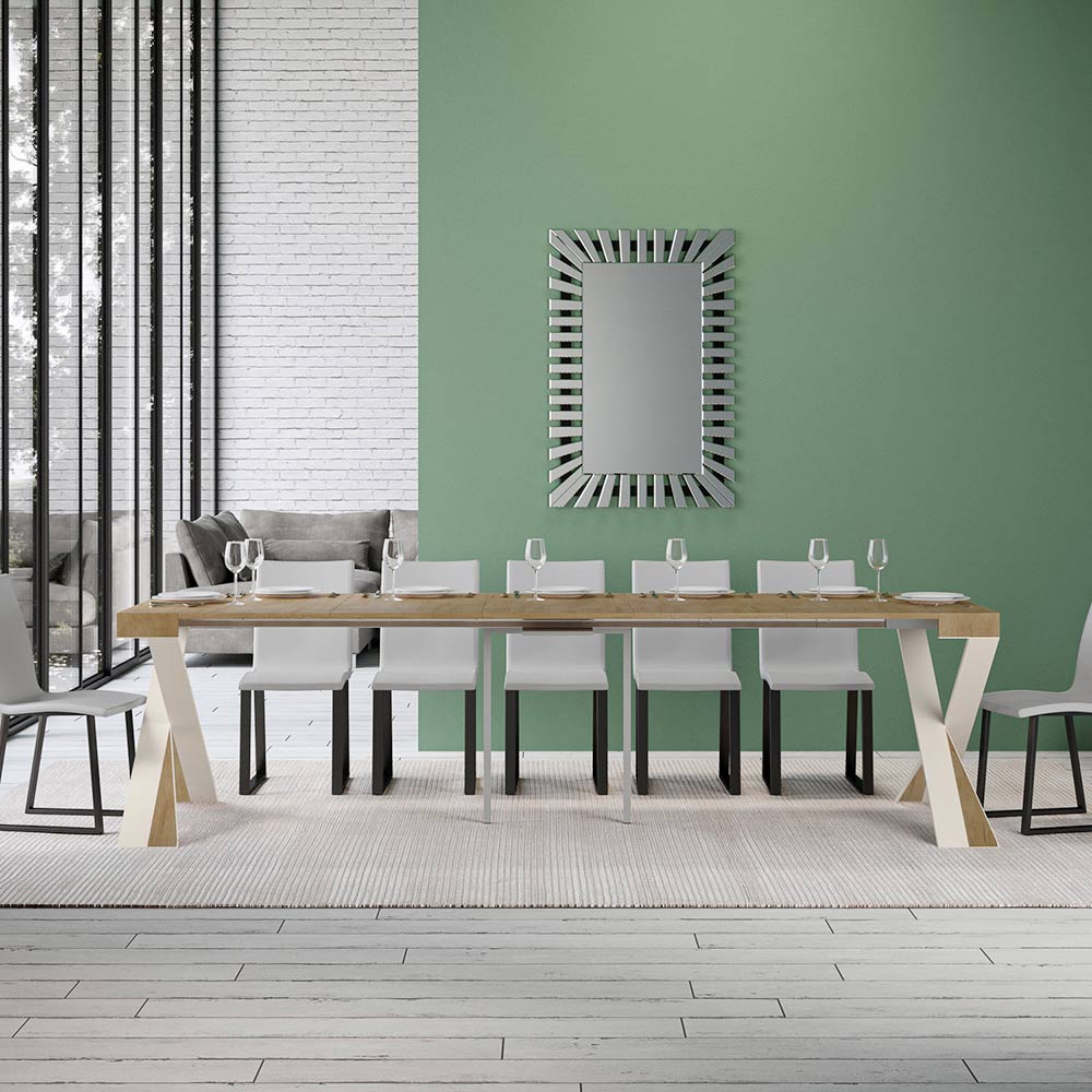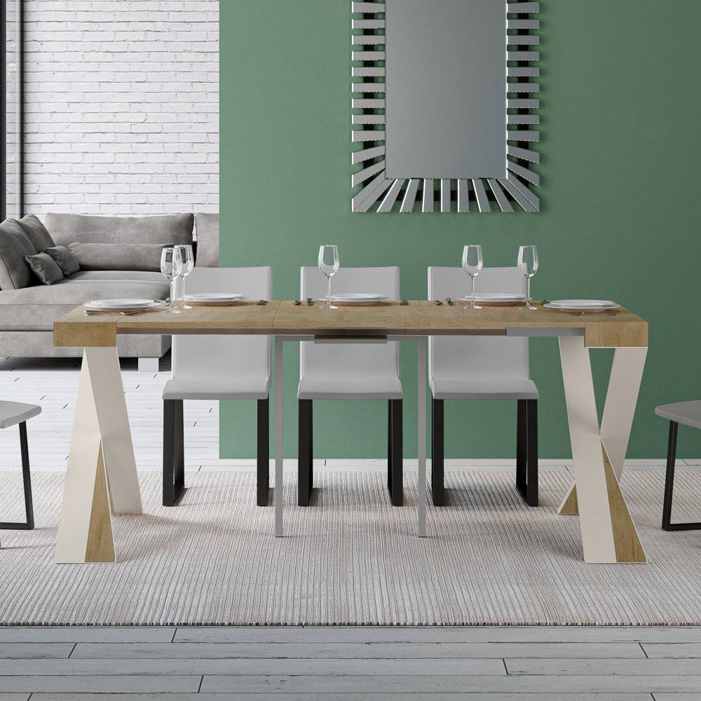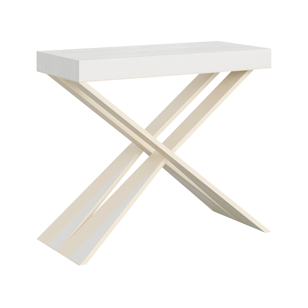 Dette udtrækkelige konsolbord er et udtryk for elegance og funktionalitet i et iøjnefaldende design. Det har en moderne silhuet med en X base, der ikke kun giver solid støtte, men også tilføjer et strejf af sofistikeret originalitet. Toppen i møbleret træè en hyldest til kvaliteten af Made in Italy, der er værdsat for sin holdbarhed og evne til at modstå tidens gang.