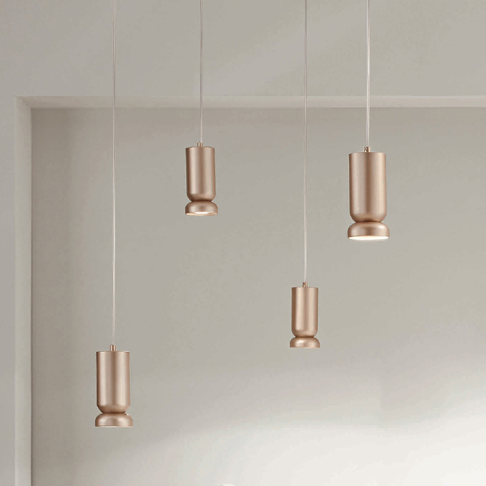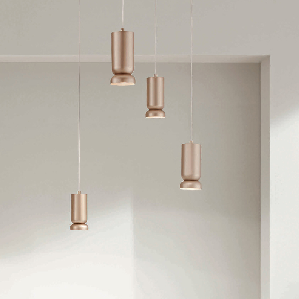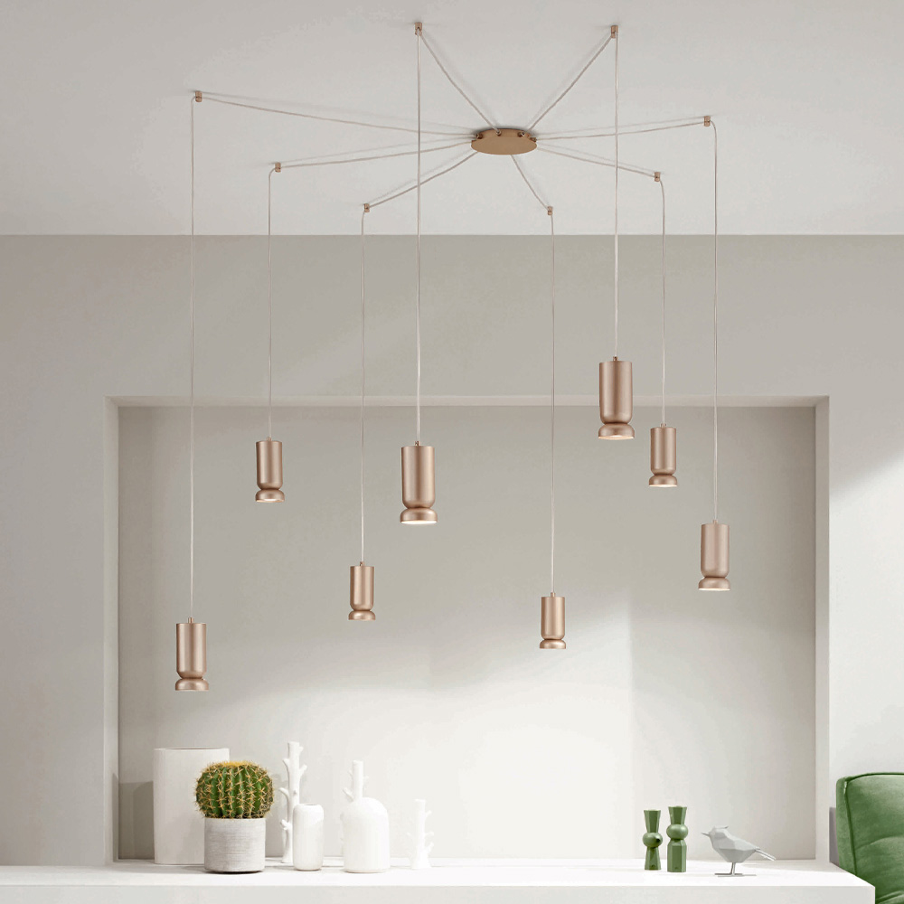 pulverlakeret aluminium med guldfinish. Alle kabler er justerbare, både i bredden i loftet og i længden med lygterne.