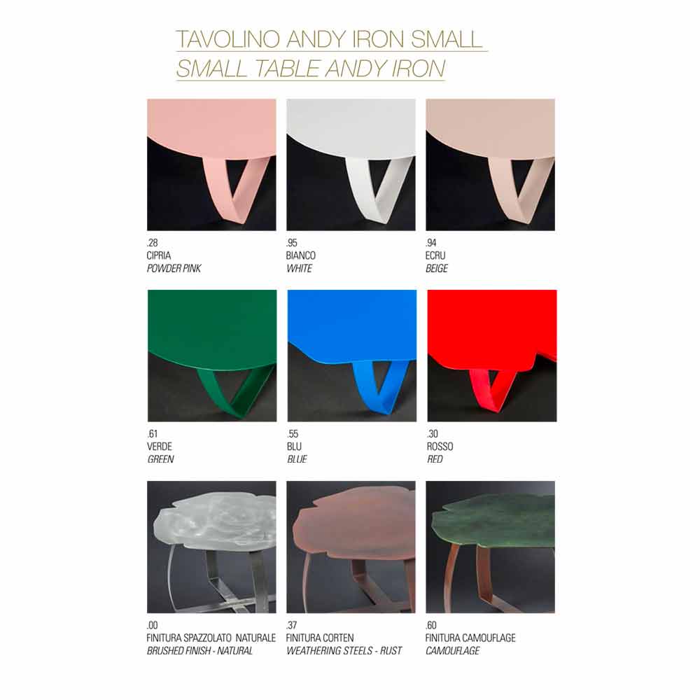 Andy er en robust tjeneste bord, enkel og elegant, med et originalt og moderne design, egnet til enhver type møbler. Sofabord fra den oprindelige form ligner en blomst, simpel, stiliseret, kendetegnet ved enkle linjer, aktuelle og ungdom, kan bringe et strejf af kreativitet i ethvert miljø, hvor det er placeret. Tabel uforlignelige og unikt design, er dens væsentlige kendetegn indesluttet i det anvendte materiale, der udelukkende er fremstillet af metal laserskåret blomsterformet med en base også i buet metal, malet i samme farve som bordpladen med undtagelse af i camouflage finish, . Højstyrketråden epoxybelægning fås i forskellige nuancer.
