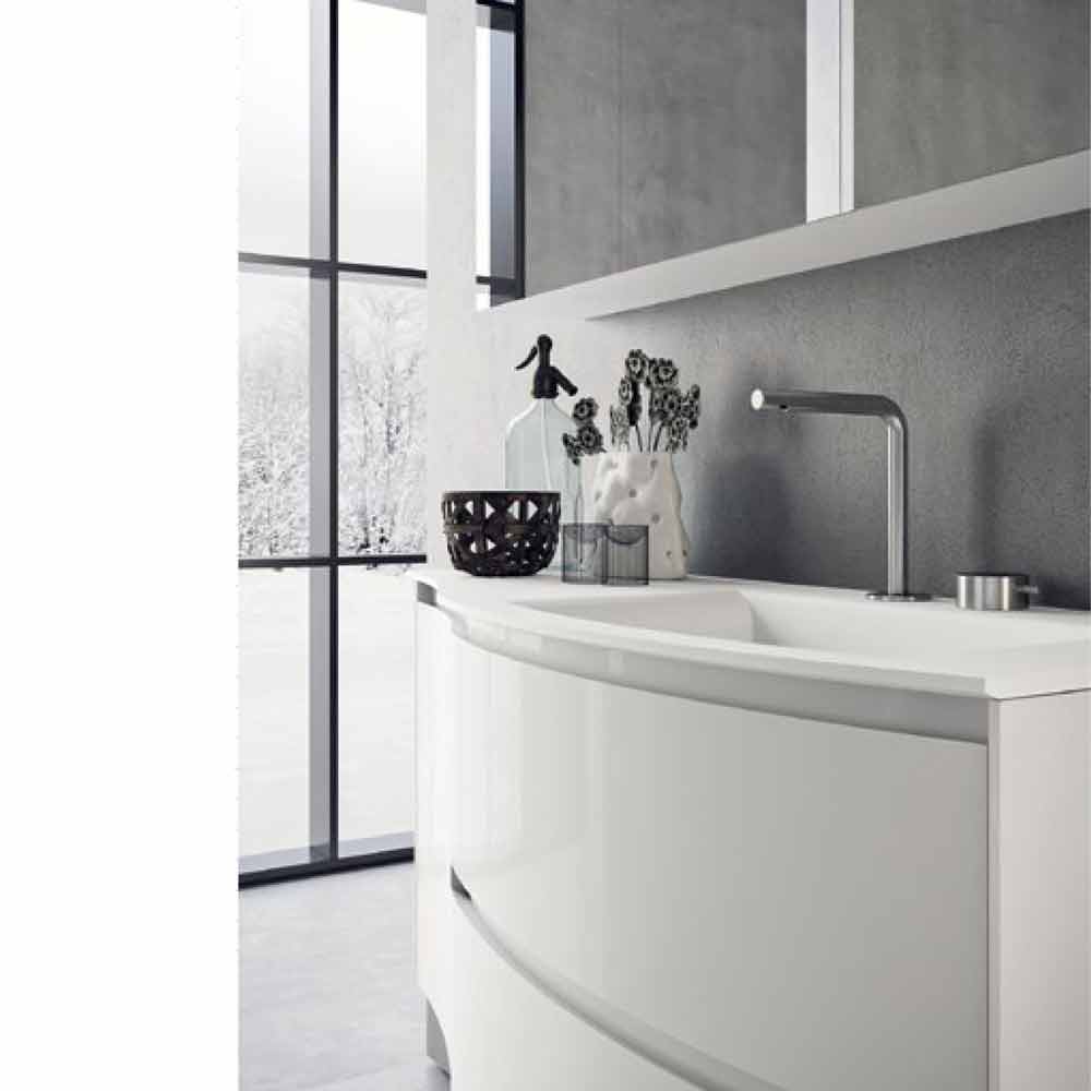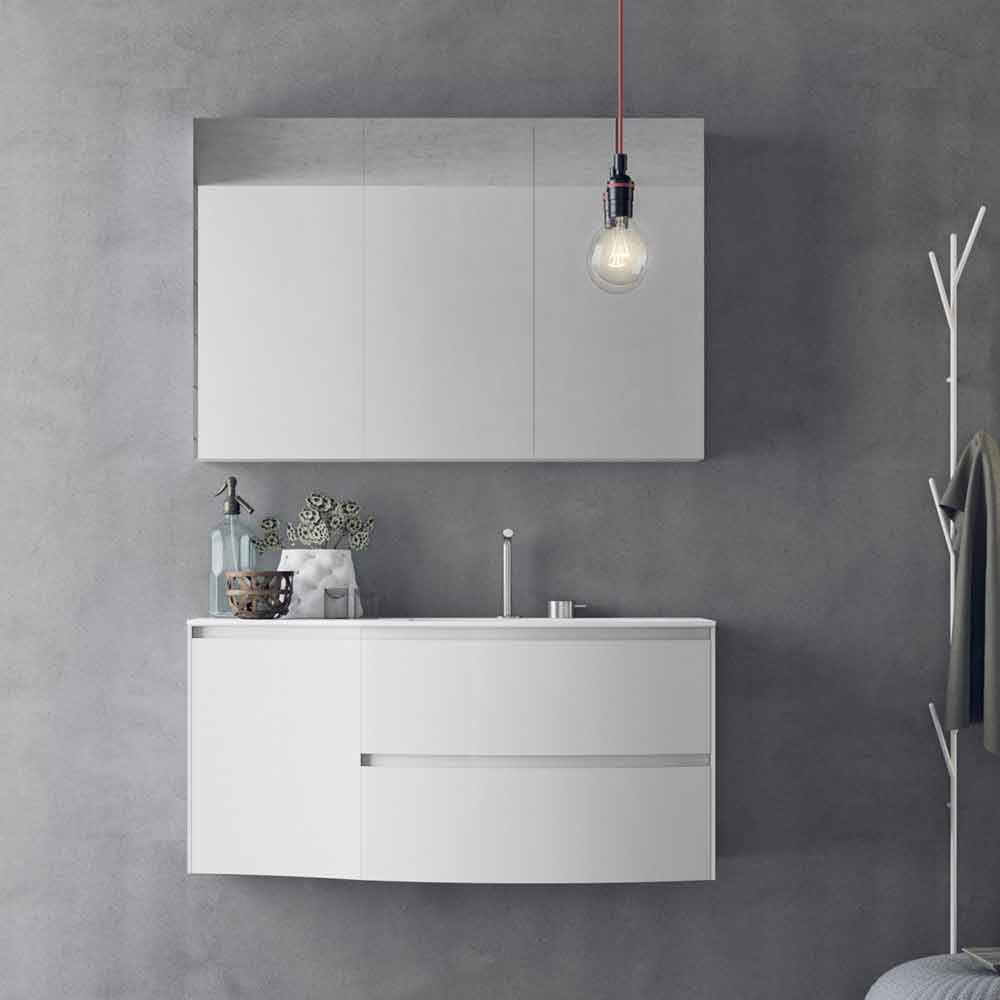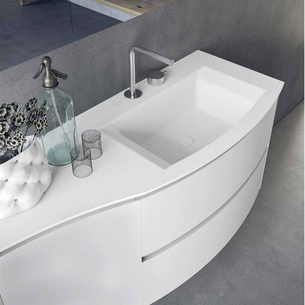 Minimal badeværelsessammensætning, ophængt og buet design med integreret vask, fremstillet i Italien.