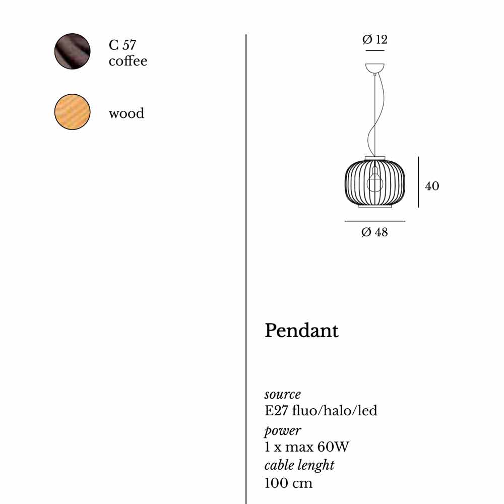 Suspension lampe fremstillet af formet stål stang og malet med epoxy pulvere. De to bånd, der lukker kroppen er afrundede naturtræ.