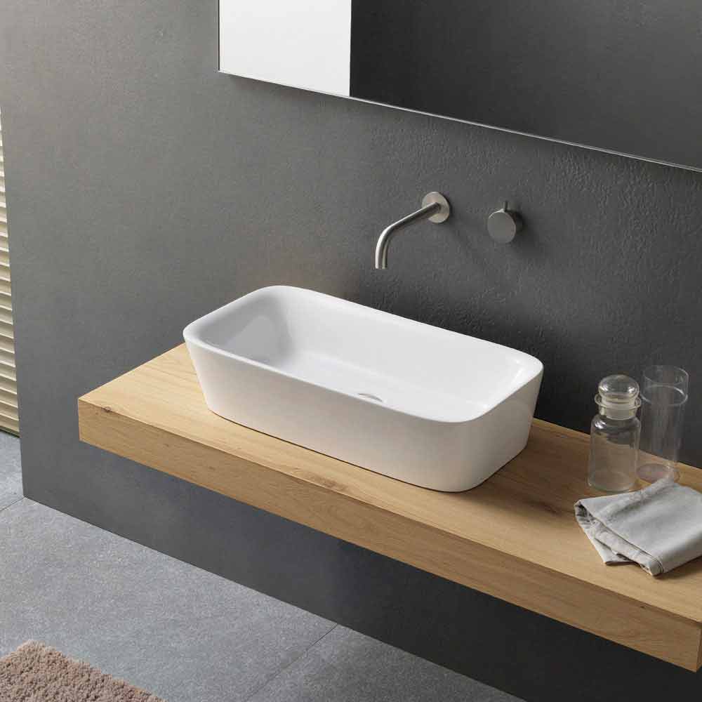 Bordvask i hvid keramik, moderne rektangulært design med høje og afrundede kanter, fremstillet i Italien.