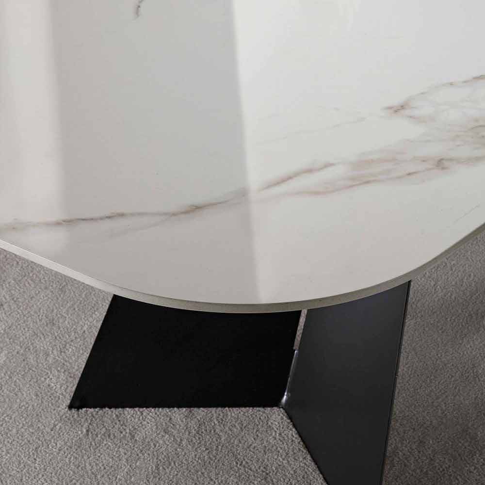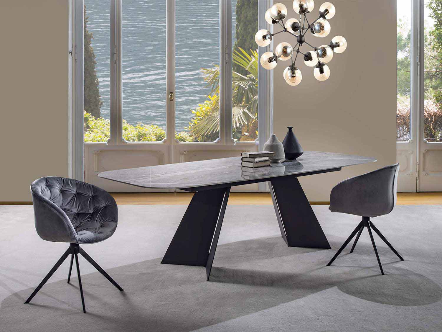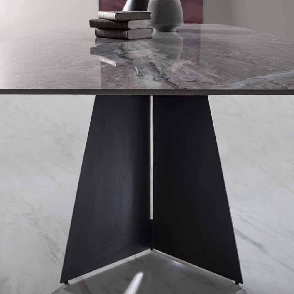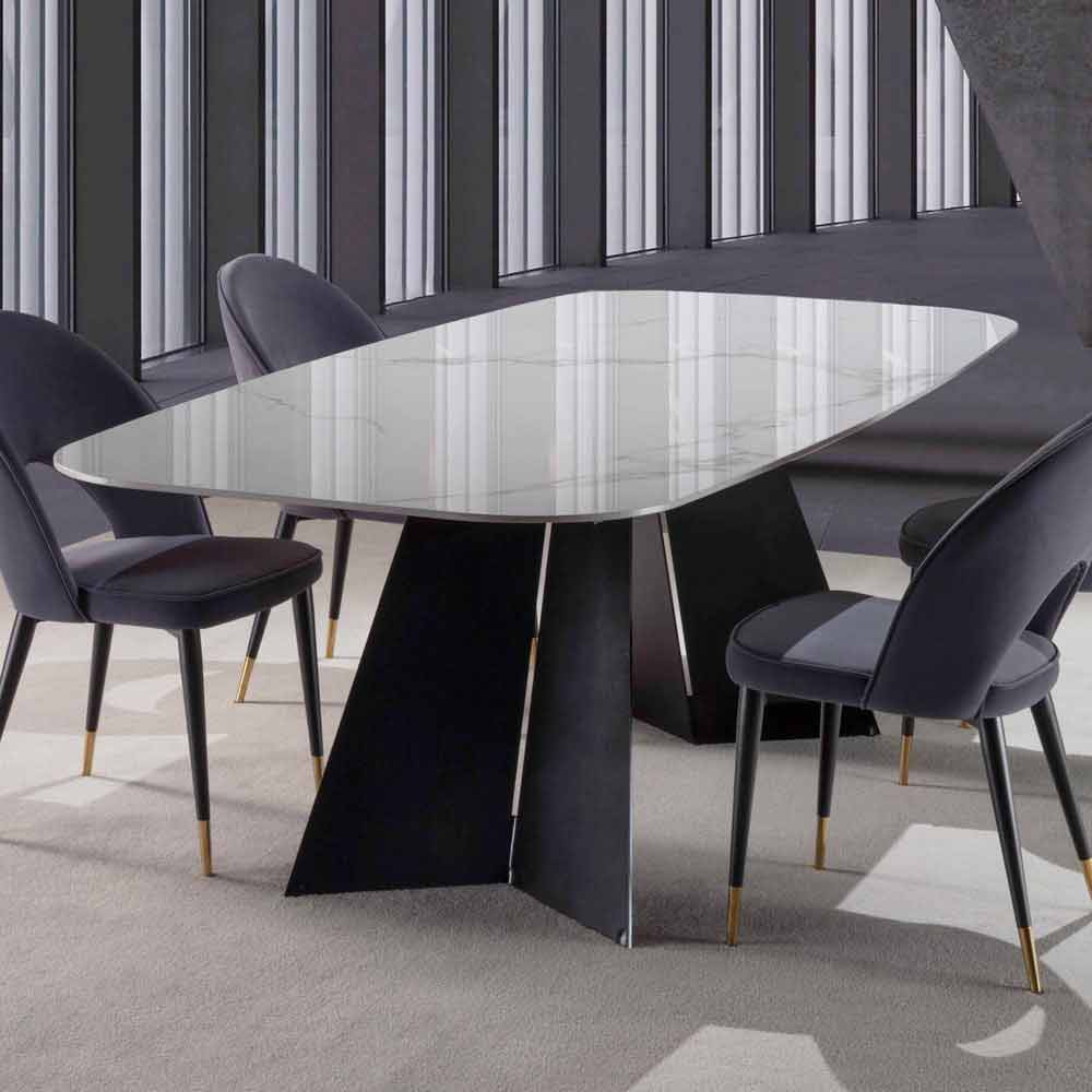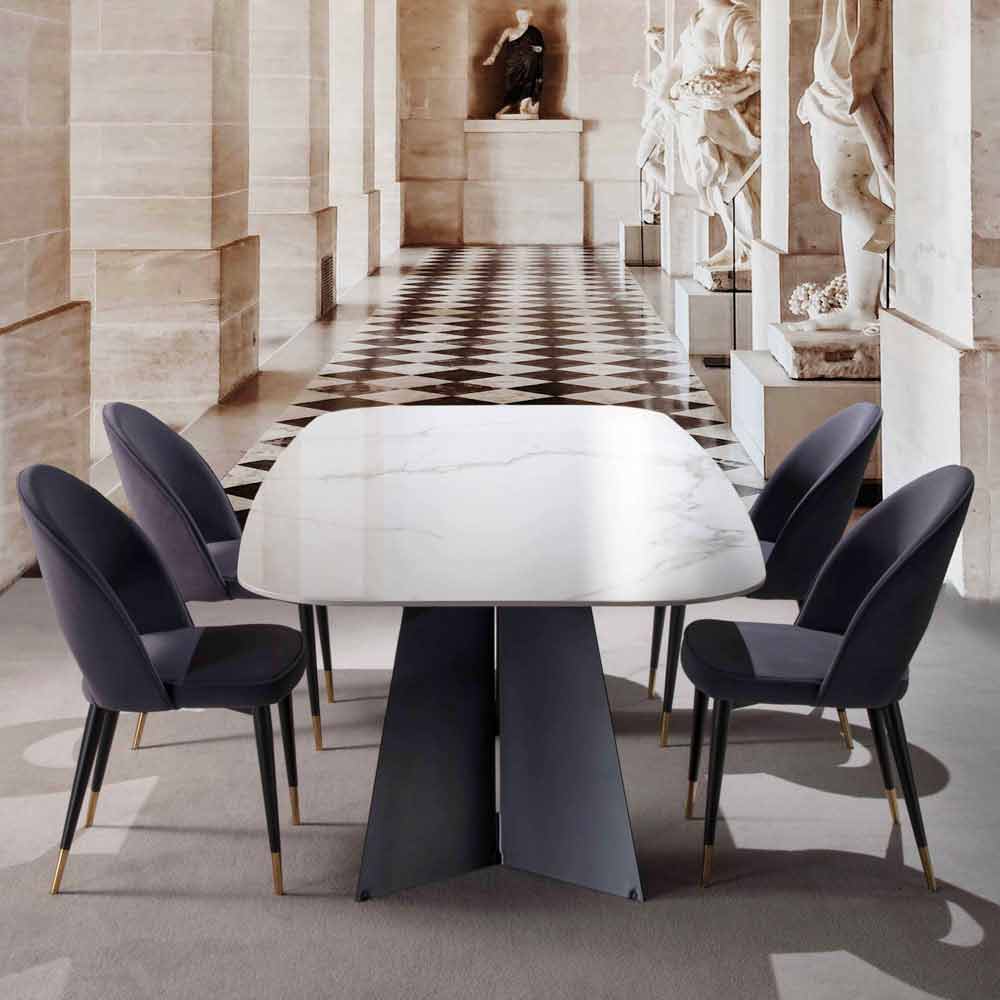 moderne og moderne design. Produceret med en afrundet form af hjørner, lukket i en elegant og tynd linje, er det designet til at møblere med smag og stil spisestue og opholdsstue. Hans struktur er i malet stål, og selv benene på dette bord er en detalje i designet.