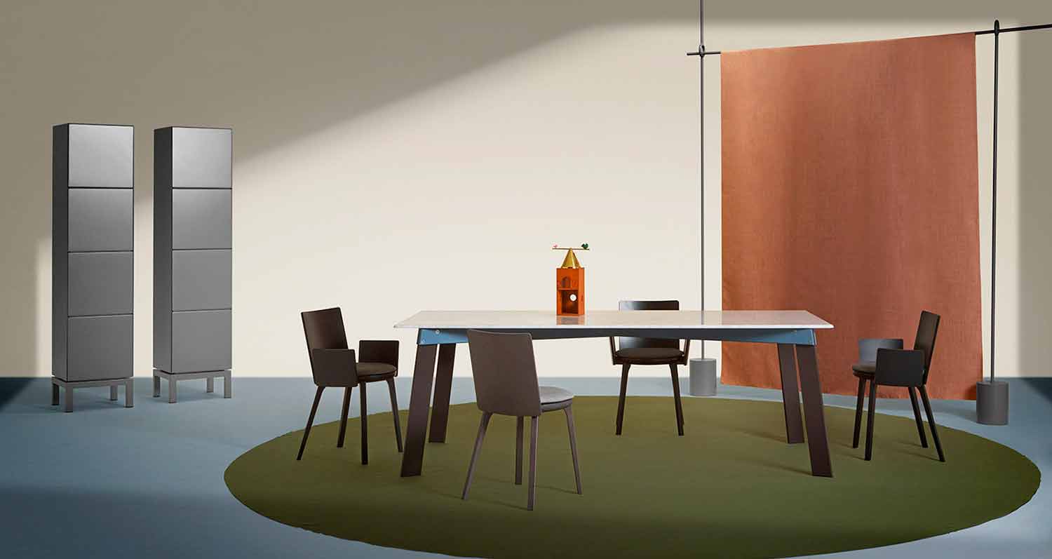 Originalt og funktionelt , stålendernes gaffeldesign tillader isætning af benene, også i stål, med et enkelt monteringssystem. En teknisk og praktisk detalje, der også bliver æstetisk: Samlingsskruerne og valget af matchende eller kontrasterende farver fremhæver den og skaber en