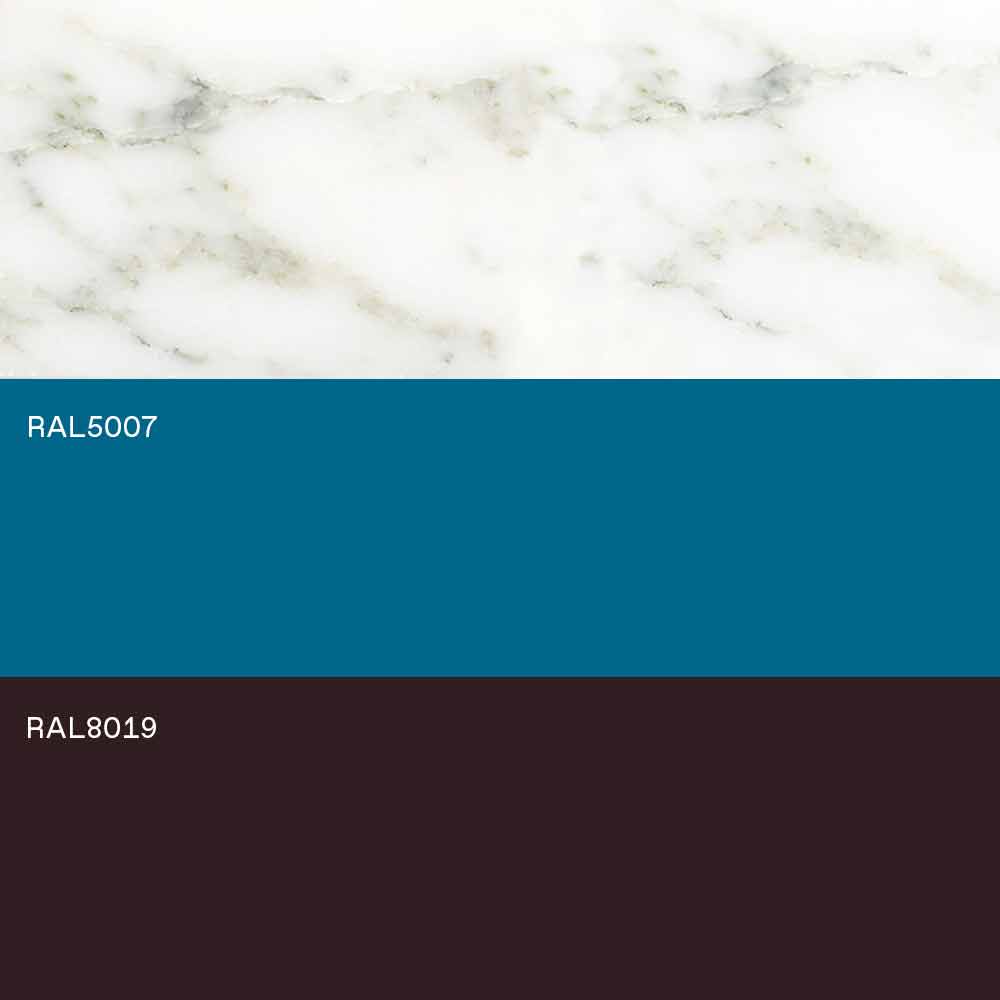 Finish : kaffe RAL8019 + kryds i lyseblå RAL5007 + top i hvid Michelangelo marmor