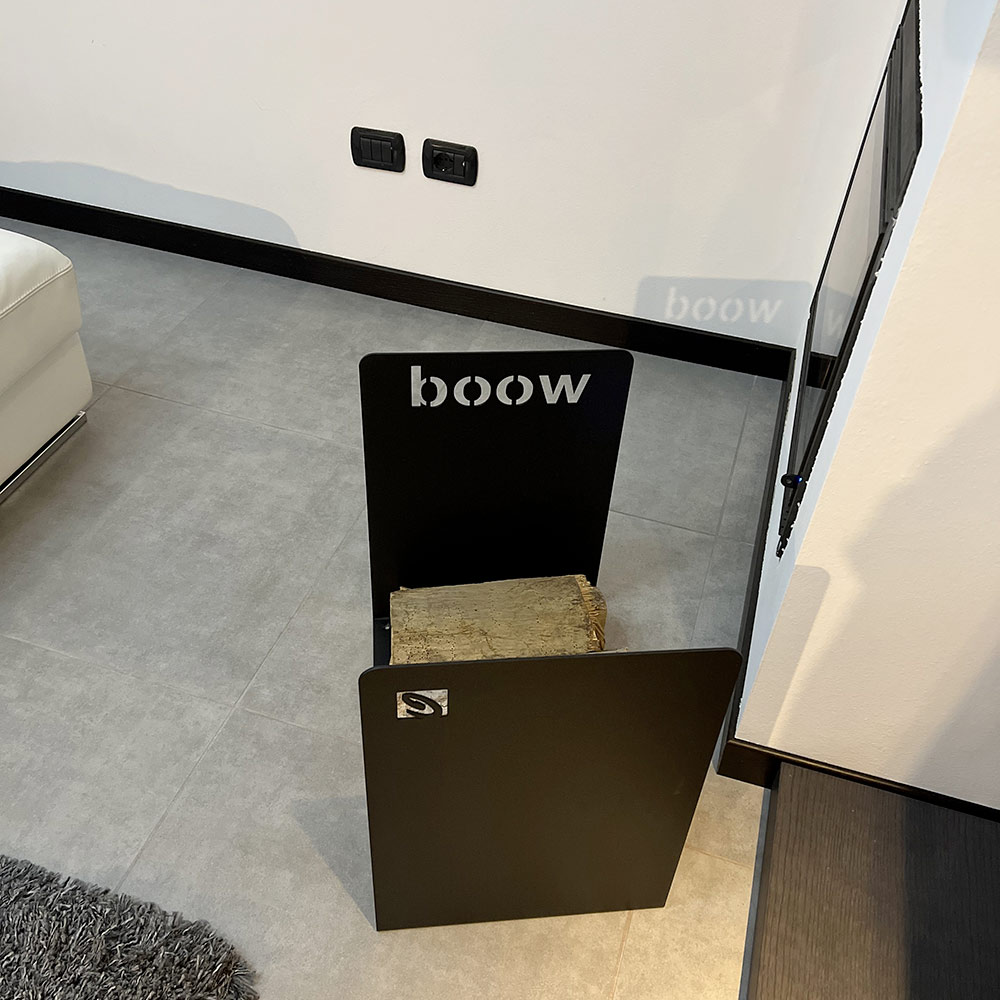 Brændeholder til pejs i ikke-giftigt pulverlakeret stål af høj kvalitet. Designet, designet og håndlavet i Italien med det formål at fremhæve ikke kun nytten af selve bjælkeholderen, men også dens æstetiske værdi.