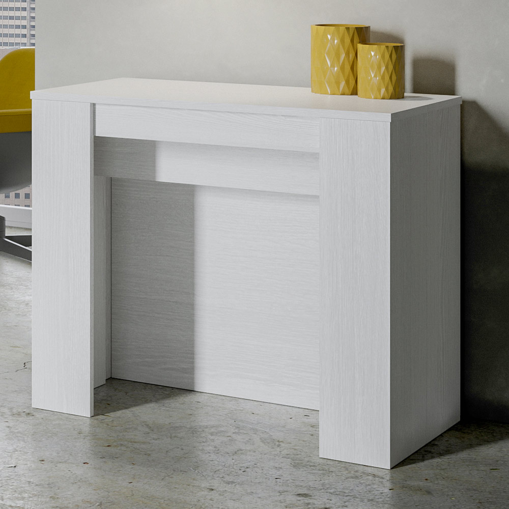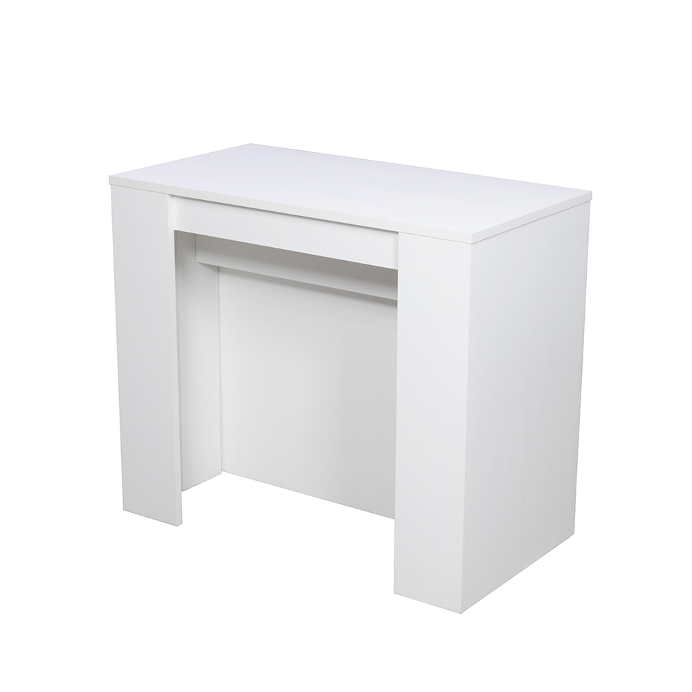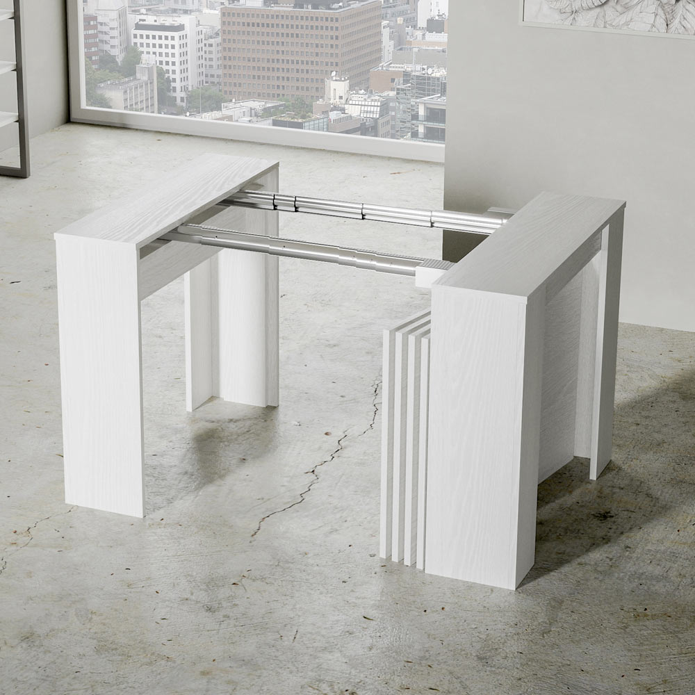 Lad dig fortrylle af renheden og funktionaliteten i dette udtrækkelige konsolbord, et møbel, der repræsenterer indbegrebet af versatilitet i det moderne.