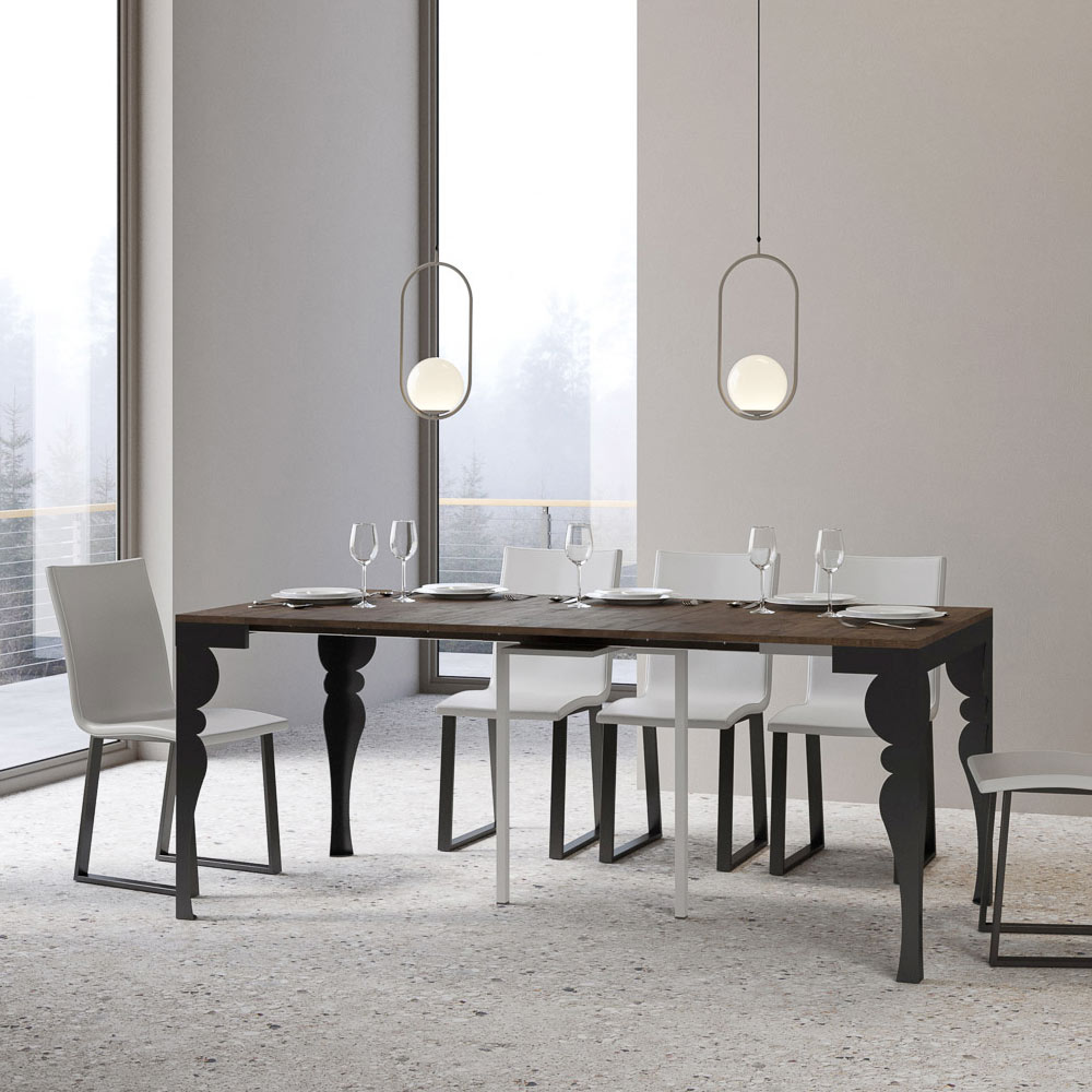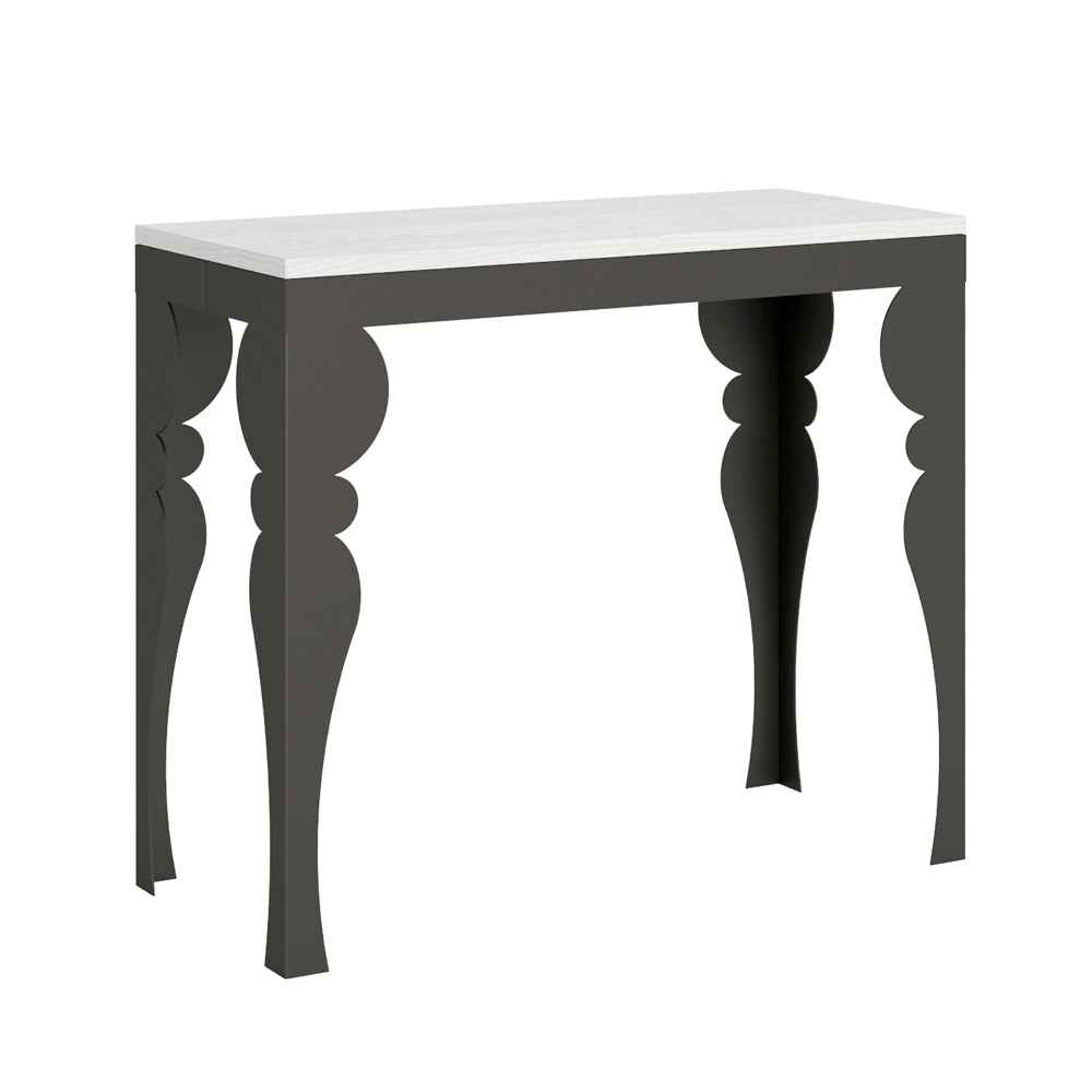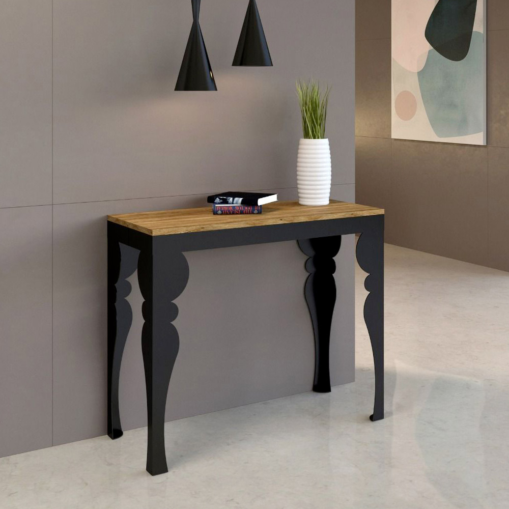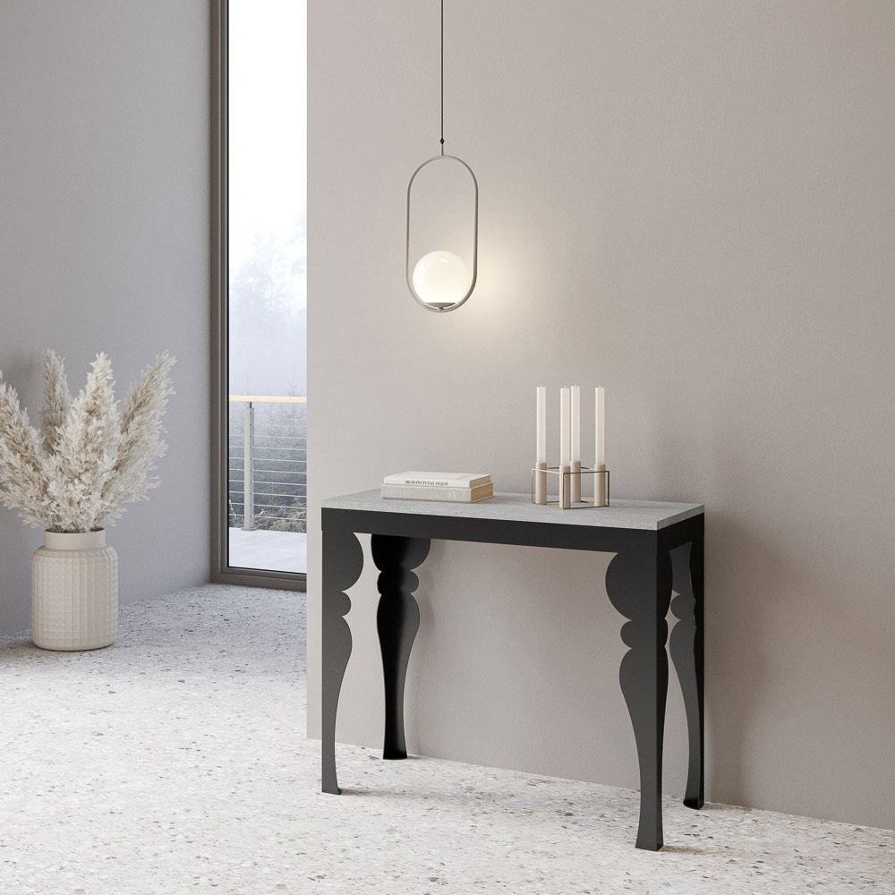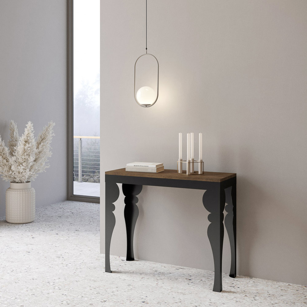 Kontrasten mellem benenes antracitgrå og toppens træ skaber en visuelt stimulerende dialog, der gør dette møbel til et sofistikeret valg til ethvert rum. Konsolbordet er perfekt som indgangsmøbel eller som en ekstra overflade i en stue, og det forvandles let og kan udvides til at blive midtpunktet i en spisestue, klar til at være vært for mindeværdige øjeblikke.