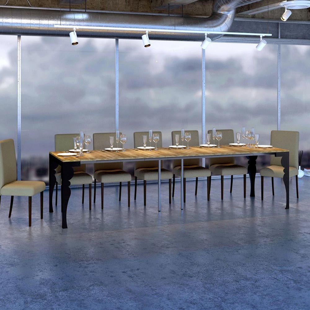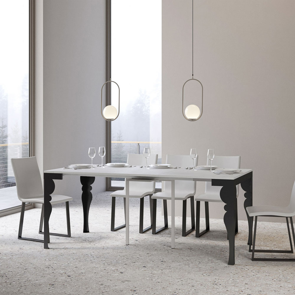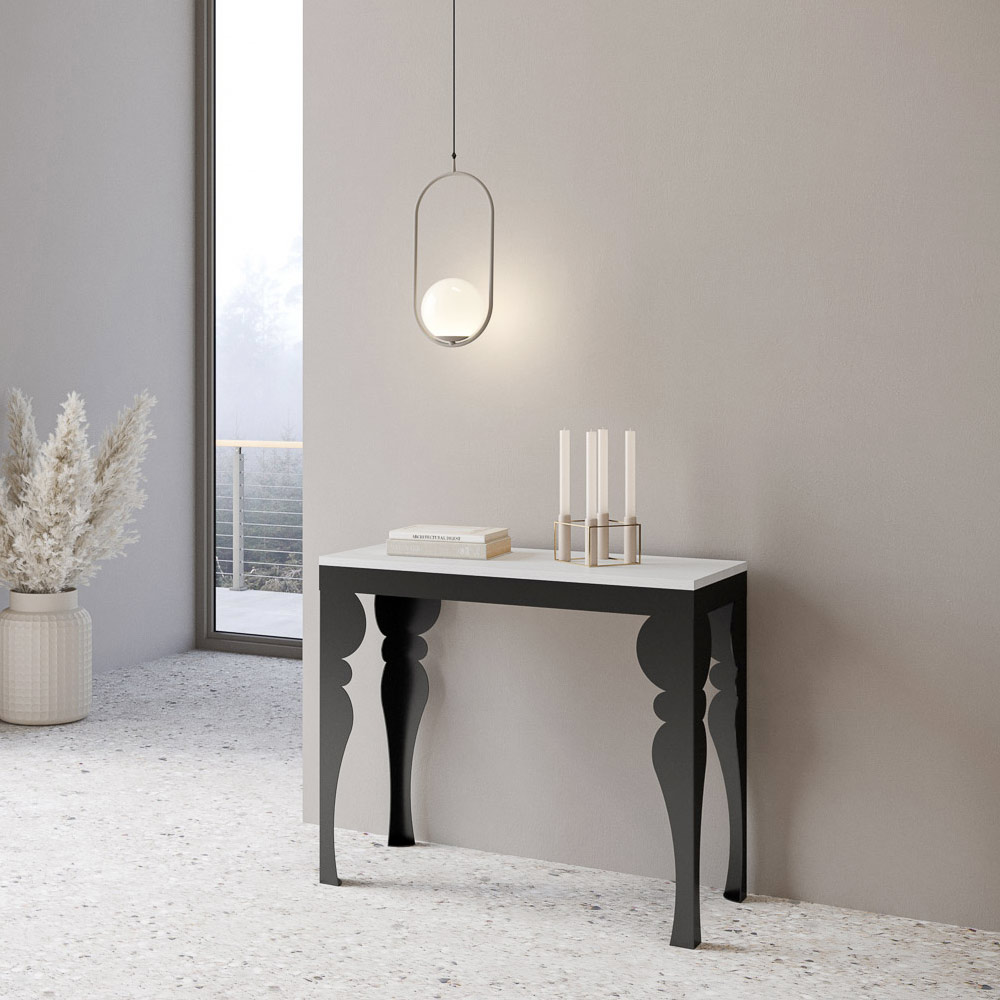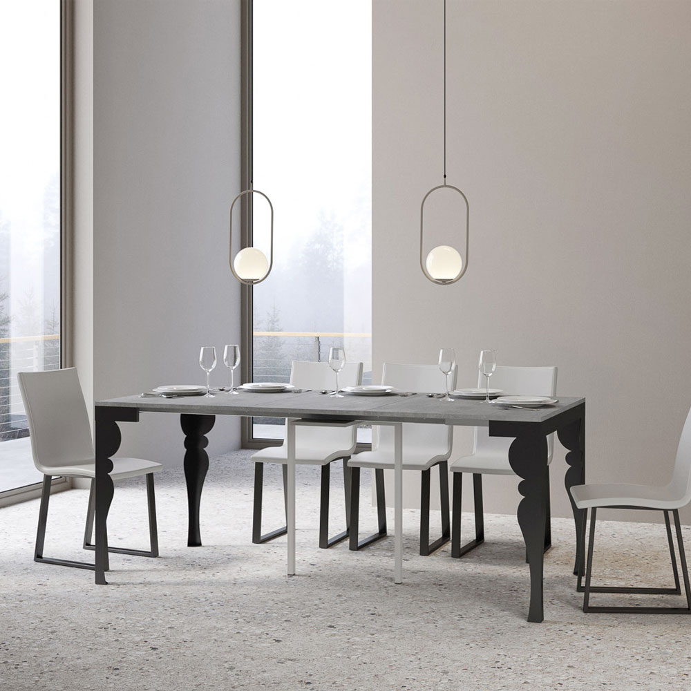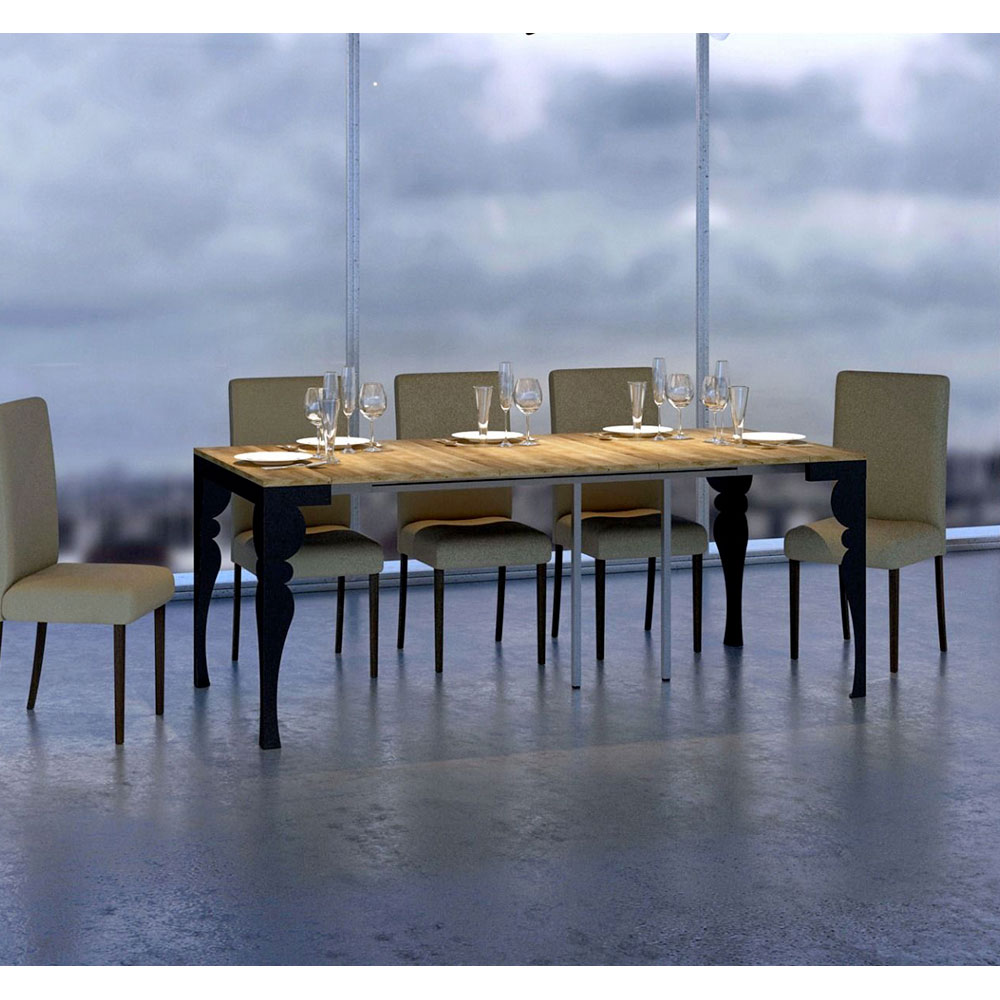 Kontrasten mellem benenes antracitgrå og toppens træ skaber en visuelt stimulerende dialog, der gør dette møbel til et sofistikeret valg til ethvert rum. Konsolbordet er perfekt som indgangsmøbel eller som en ekstra overflade i en stue, og det forvandles let og kan udvides til at blive midtpunktet i en spisestue, klar til at være vært for mindeværdige øjeblikke.