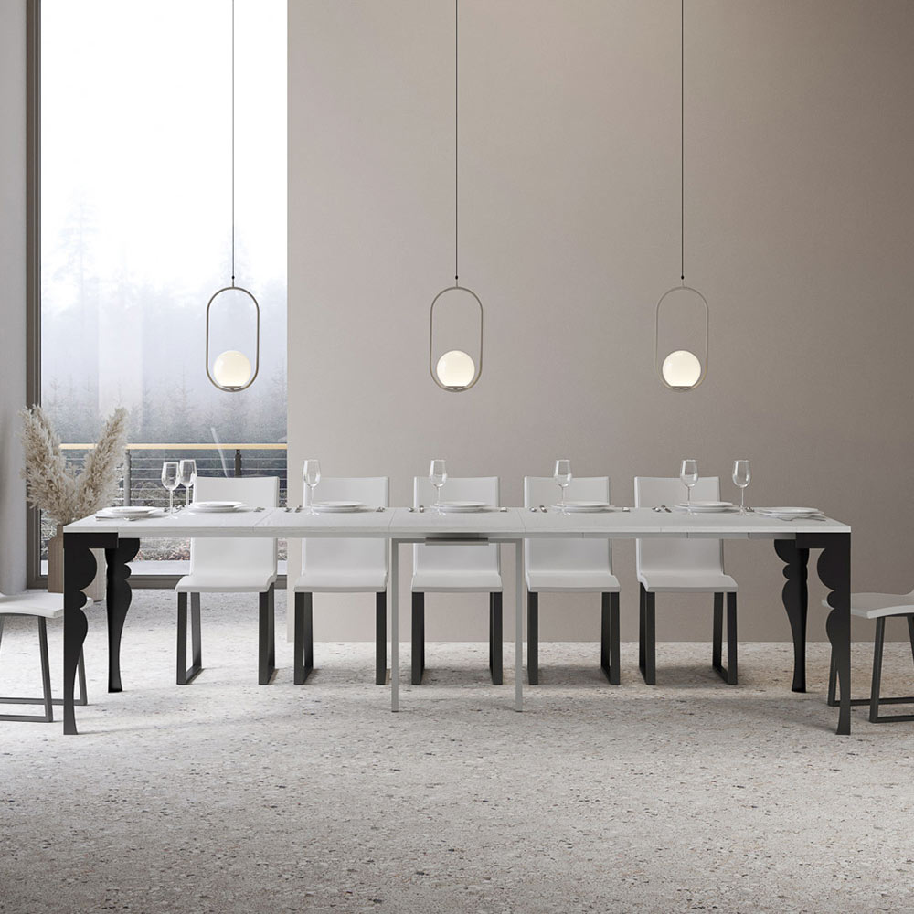Dette udtrækkelige konsolbord repræsenterer en sublim fusion af elegance og opfindsomhed. Med sine udskårne ben, der leder tankerne hen på tidligere tiders ynde, præsenterer konsolbordet sig som et designobjekt, der kombinerer historie og modernitet.