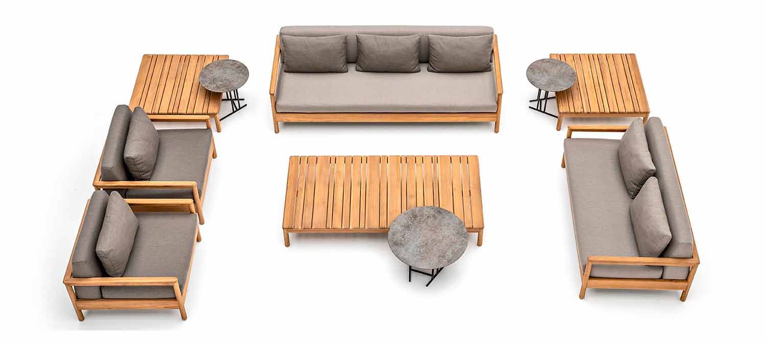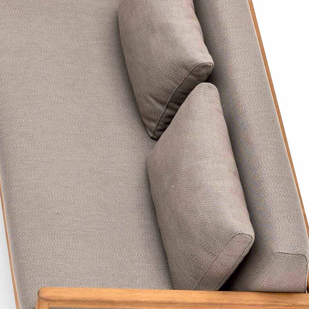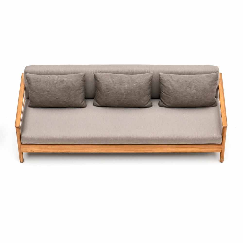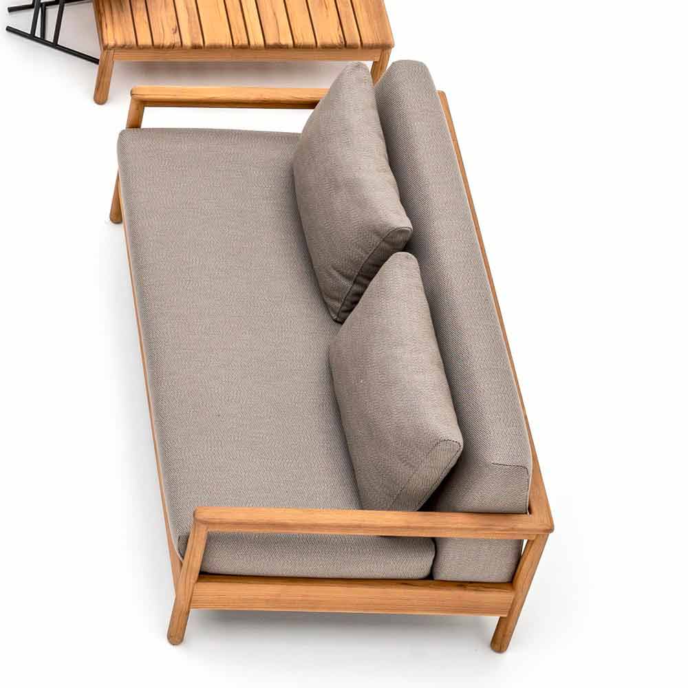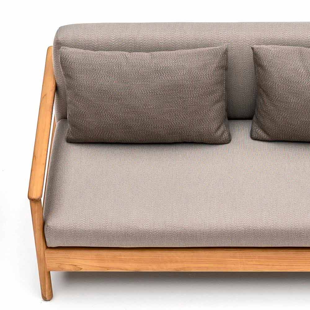Bali er en grandiøs havnesofa, der er karakteriseret ved en synlig understøtningsstruktur i certificeret massivt teakplantningstræ og sæder og dobbelt rygsæk dækket af stof og polstret med Dryfeel-gummi.