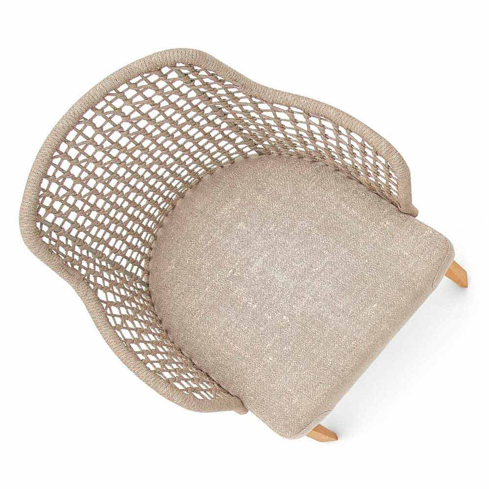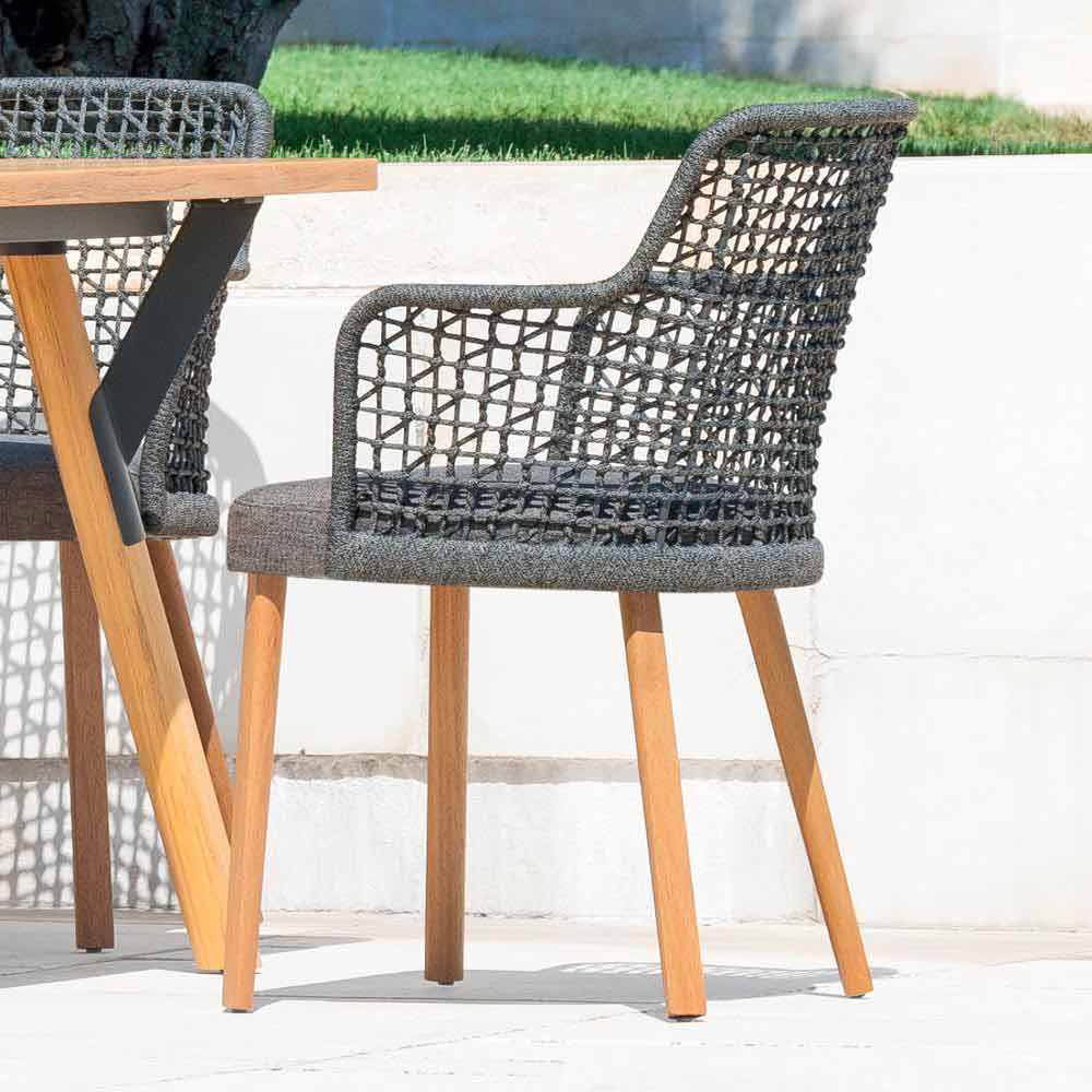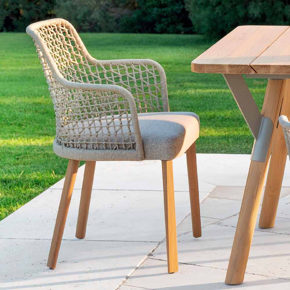 Emma er en haven lænestol kendetegnet ved en håndvævet syntetisk fiber struktur med beige eller mørkegrå pulverlakeret aluminium ramme .