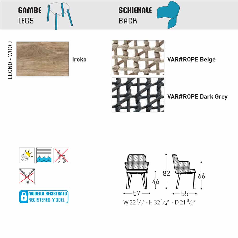 Den leveres også med massive iroko træben og et sæde betrukket i stof med en polypropylen sæde struktur.