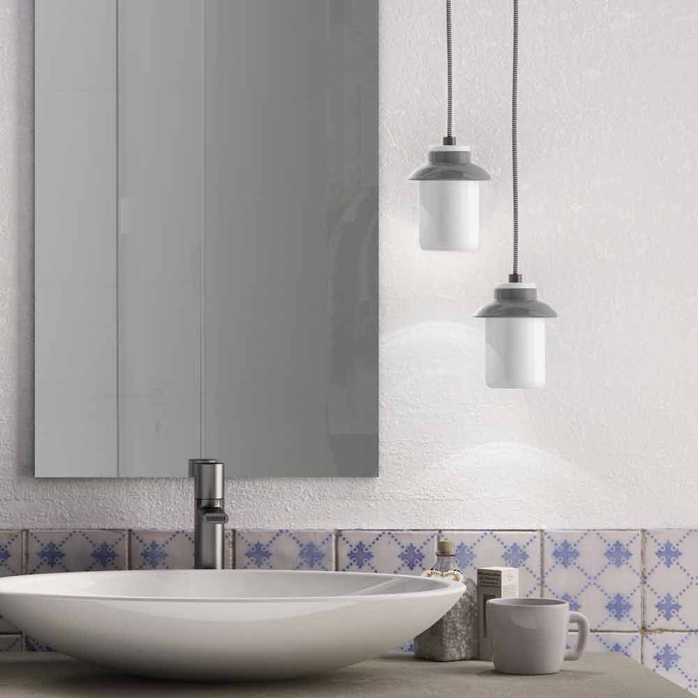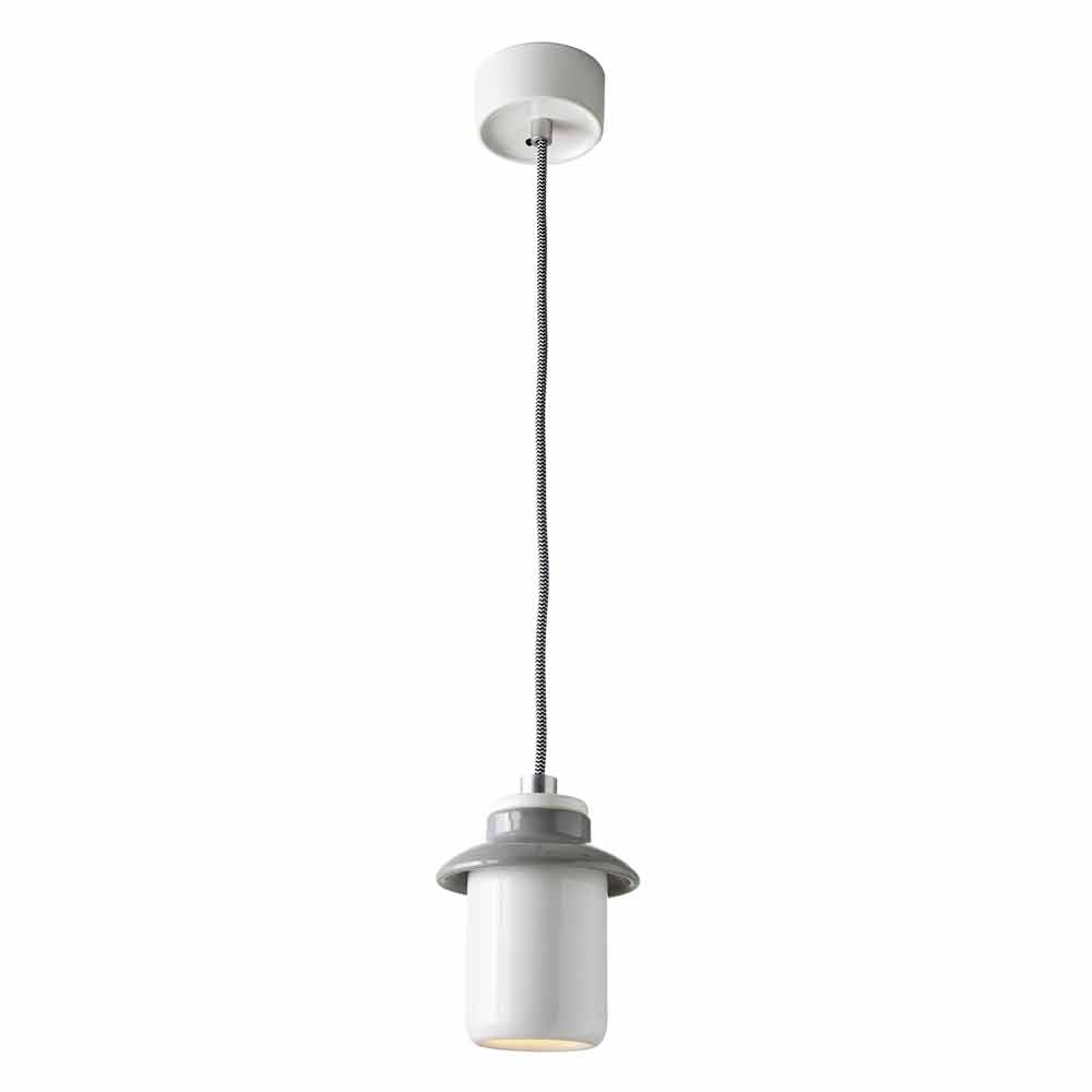 Asien er en fantastisk ophængslygte lavet af hvid og grå keramik, med sort og hvidt kludkabel og aluminiumskabelklemmen.