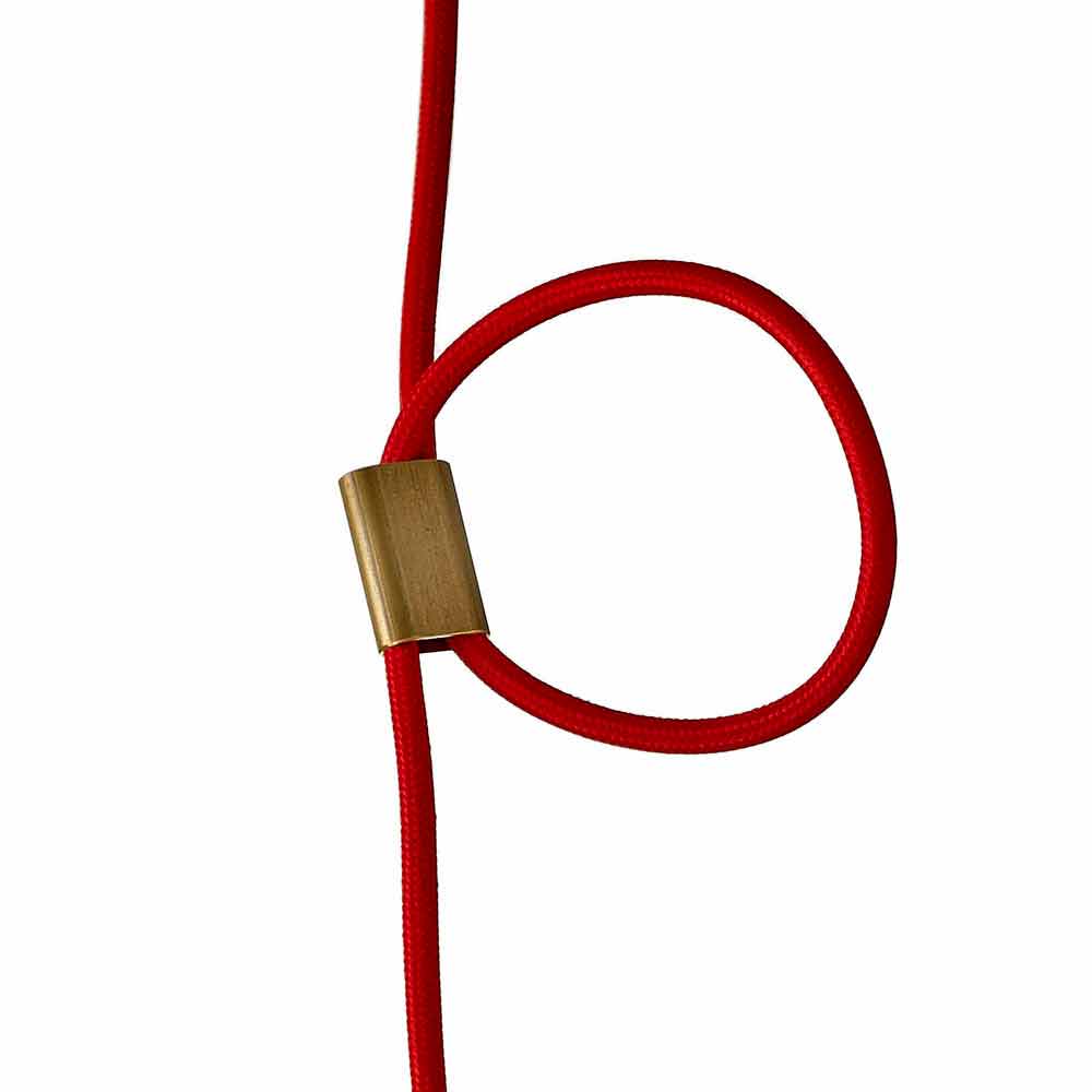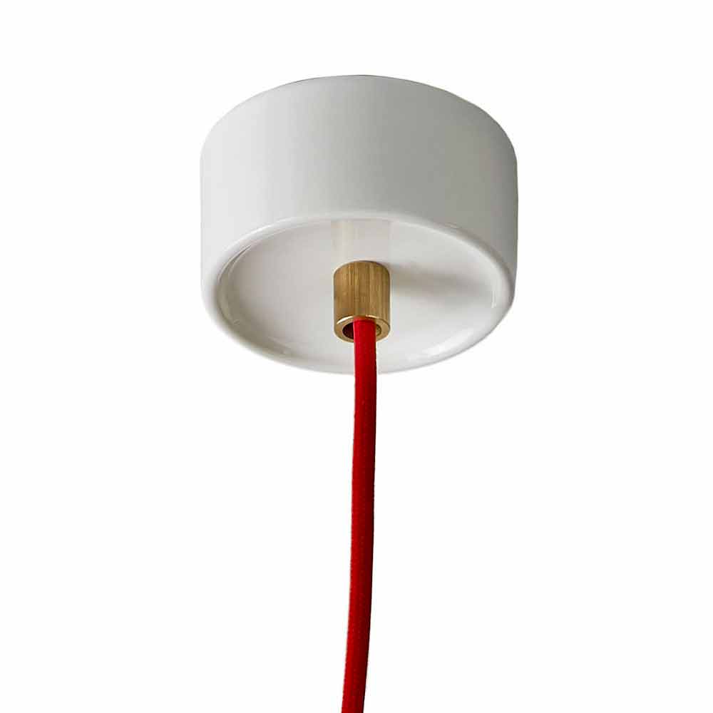 Farvet suspension lampe i hvid keramik og bøg træ med rød klud kabel og messing kabel klemme.