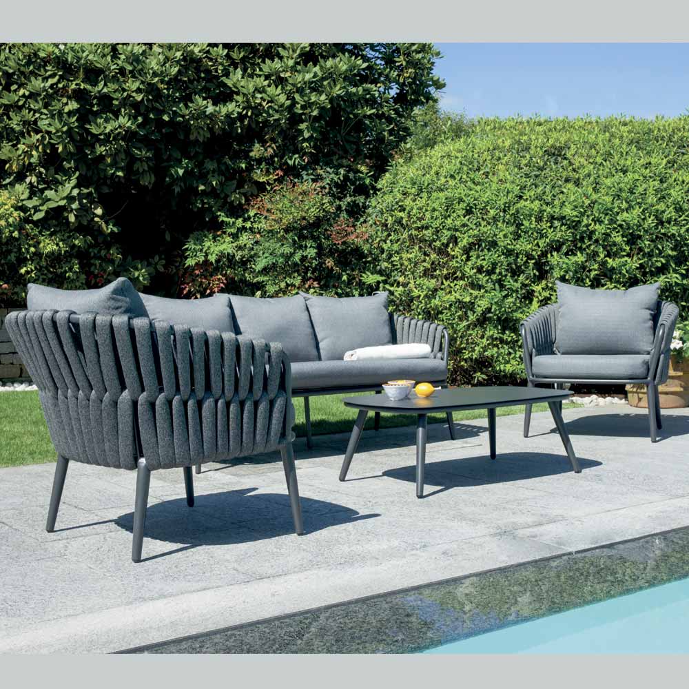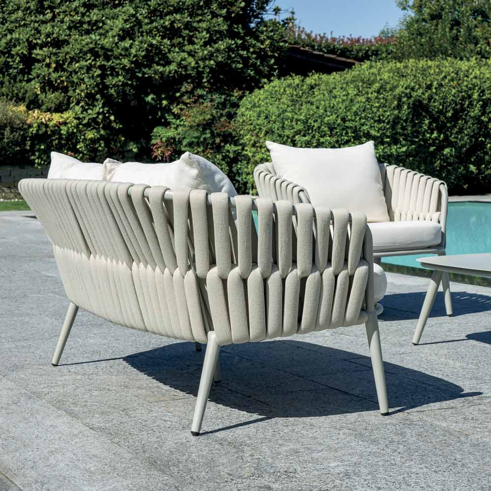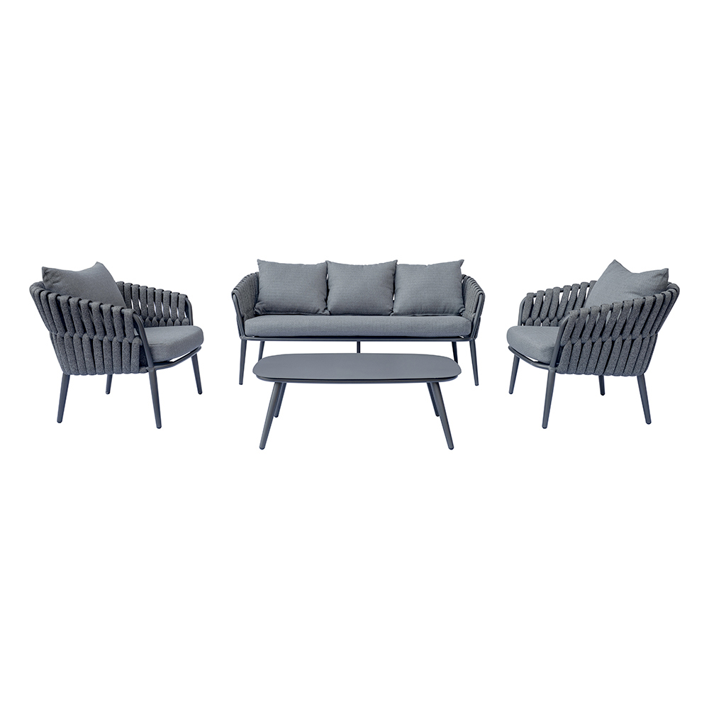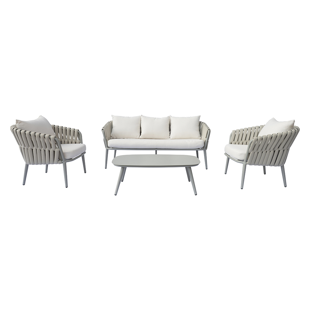 Aluminiumsstellet sikrer lethed og holdbarhed, mens polstret reb vikles rundt om sæder og ryglæn, hvilket giver et moderne, men komfortabelt præg. De aftagelige hyndebetræk sikrer praktisk anvendelighed og nem rengøring, hvilket bevarer stuens elegante og raffinerede udseende over tid.